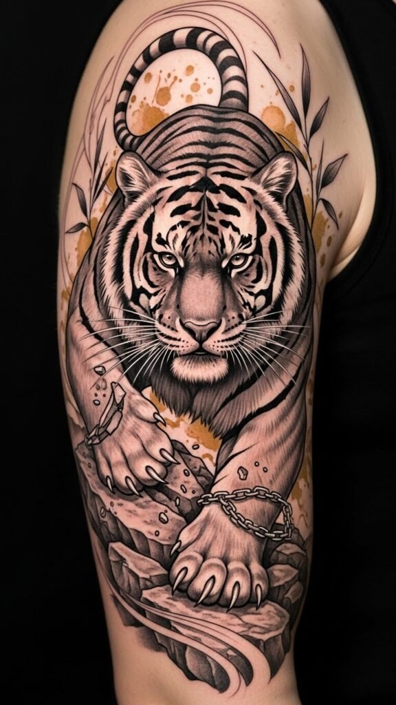 This tattoo concept uses the tiger’s forward motion, broken chains, and jagged rocks to symbolize breaking through barriers, while the muted gold watercolor and bamboo add hope and balance; it evokes determination, courage, and serene confidence, and fits a half-sleeve or outer forearm to allow the dynamic composition to flow with the musculature.