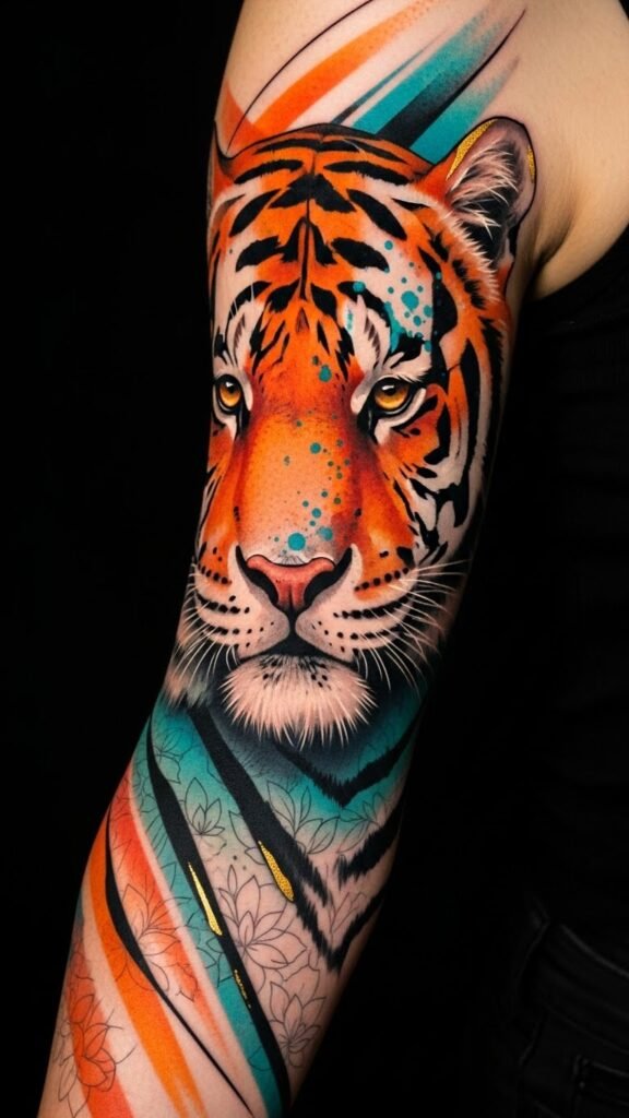 As a tattoo concept, this design channels the evolving tiger motif into a forearm wrap: a stylized tiger mid-stride rendered with bold linework and gradients of amber, teal, and deep indigo, interlaced with subtle traditional Asian patterning and geometric shards to suggest contemporary motion. Symbolically it marries courage, protection, and personal transformation; emotionally it projects confident resilience with hints of introspection. Ideal placement is the outer forearm or calf where the tiger’s flow complements musculature, allowing visibility for statement intent or easy concealment as needed.