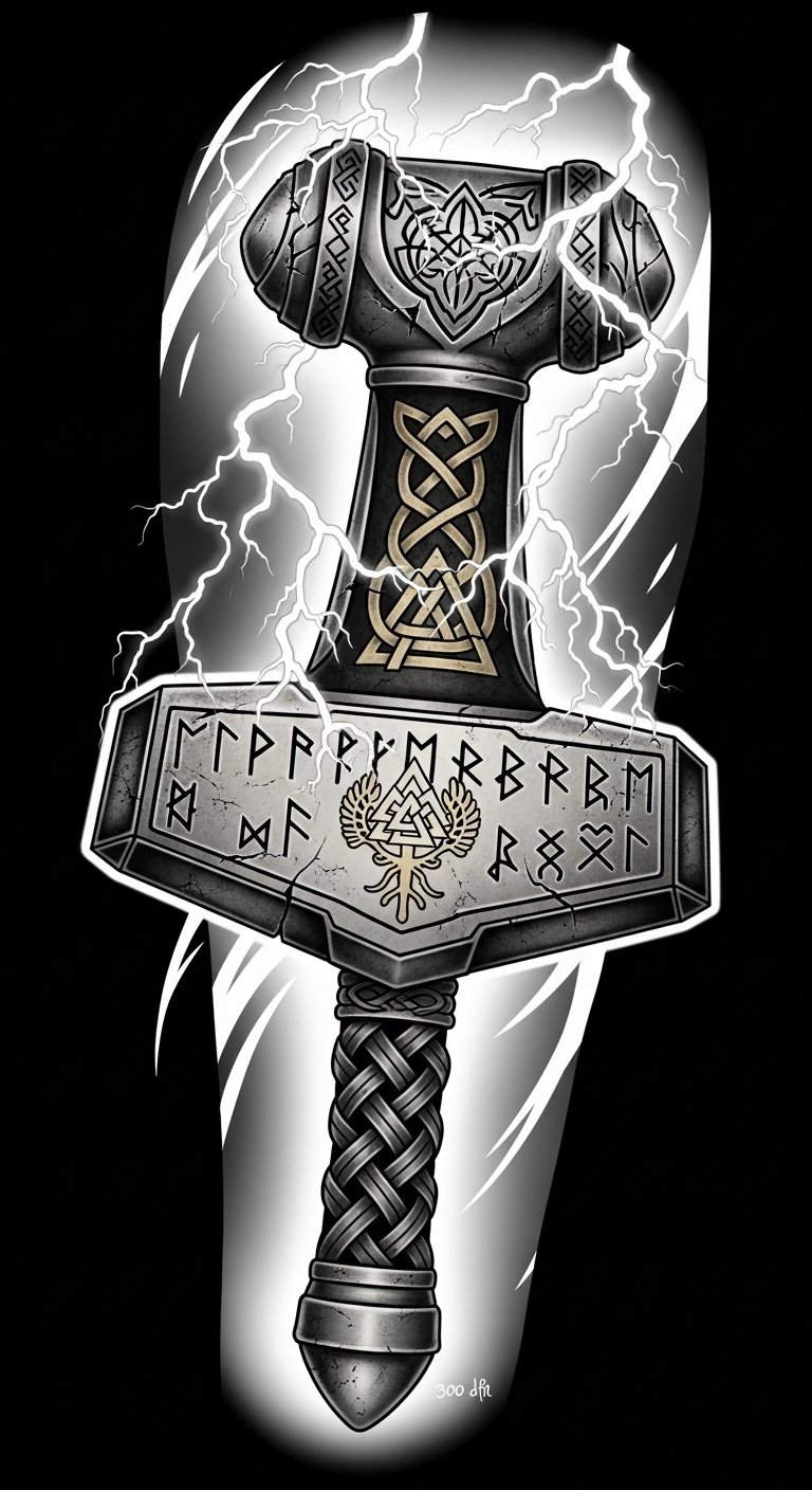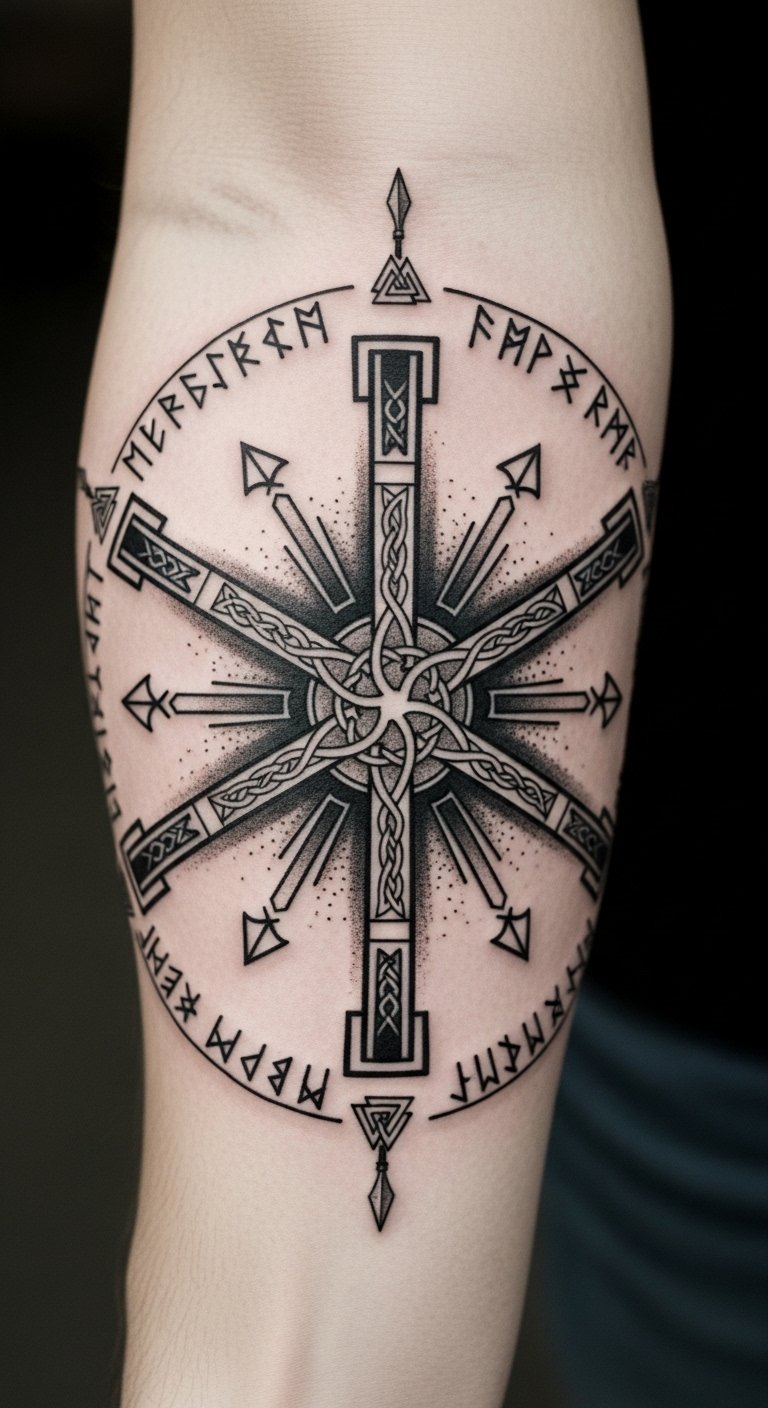 Place along the outer forearm or upper shoulder blade for a vertical composition that emphasizes the haft and knotwork; this placement conveys stoic resilience, a readiness for challenge, and a personal link to ancestral strength and protection.