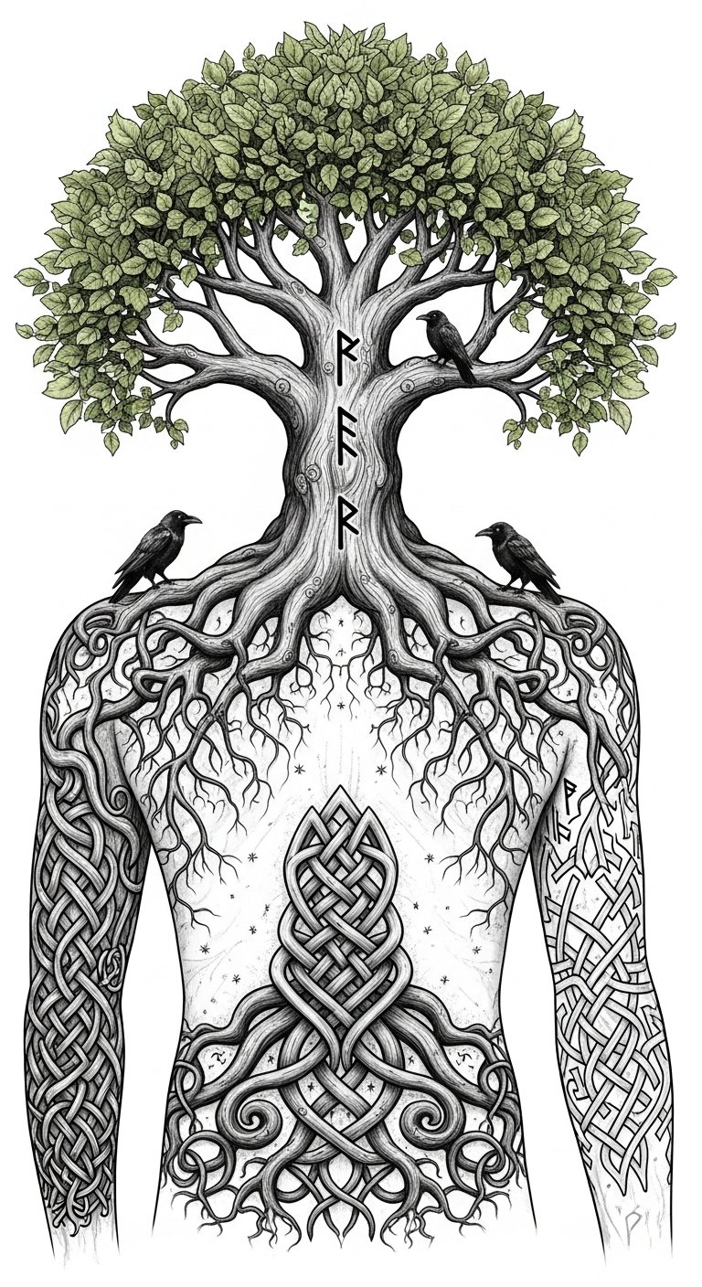 The design emphasizes continuity and balance—roots anchoring through knotwork suggest grounding and ancestry, while branches reaching toward a starfield evoke aspiration and cosmic belonging; muted greens add quiet life, ravens introduce wisdom and watchfulness, and the runes lend personal meaning.
