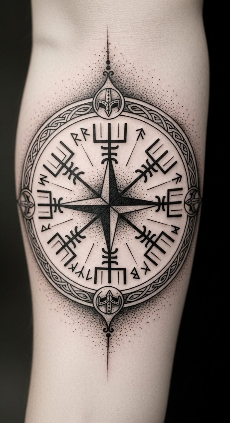 As a powerful piece of Viking symbolism, the Vegvisir inspires freedom and adventure, urging you to follow your path boldly, no matter the storms that may arise. The tattoo harmonizes the protective Helm of Awe and guiding Vegvisir to evoke resilience and courageous direction; its weathered texture suggests timeless endurance while the knotwork and runes add ancestral depth.