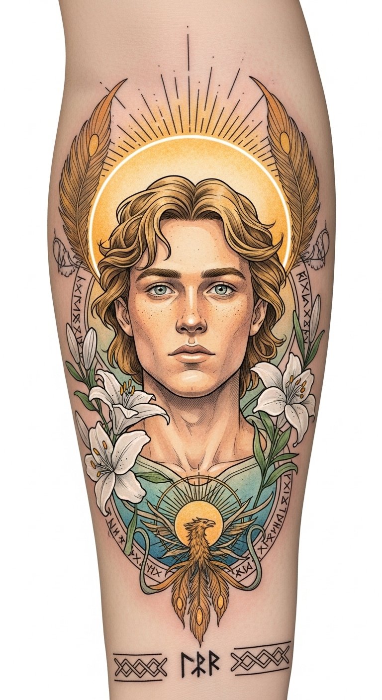 This design combines the serene visage of Baldr with botanical and phoenix elements to convey renewal and resilience; use soft watercolor tones and fine-line detailing to evoke vulnerability and grace.