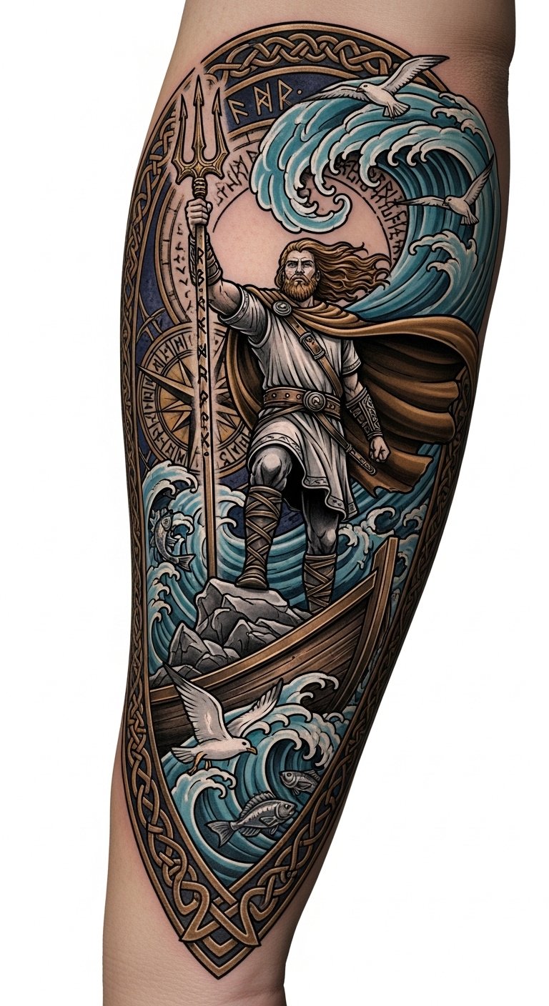 His imagery can inspire tattoos that reflect your connection to the waves, prosperity, and the wild nature of life, igniting your inner explorer. This design channels those themes through motion and contrast: the prow and trident convey protection and authority, the compass and knotwork speak to navigation and heritage, and the integrated wildlife suggests abundance and harmony;