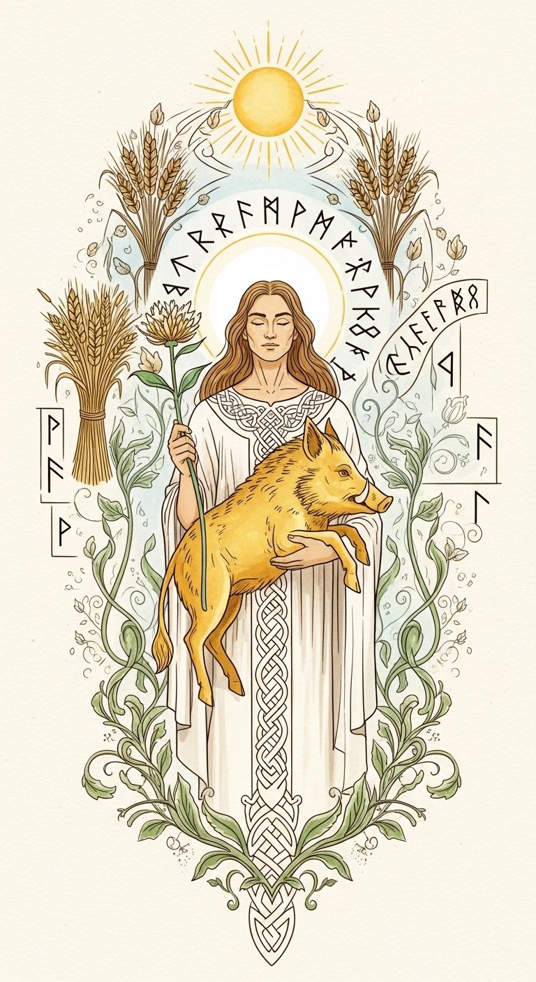 The design blends mythic reverence and intimate warmth: the boar and flowering stalk symbolize virility and renewal, grain and vines denote harvest and sustenance, and the sun and runes evoke guidance and blessing.