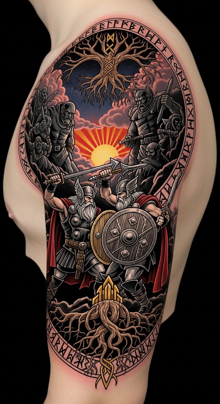 This design channels the original text’s themes—epic conflict, transformation, and cyclical rebirth—into imagery that evokes resilience and courage: gods and giants symbolize opposing forces, Yggdrasil and the breaking sun represent destruction giving way to renewal, and runes add ancestral weight.