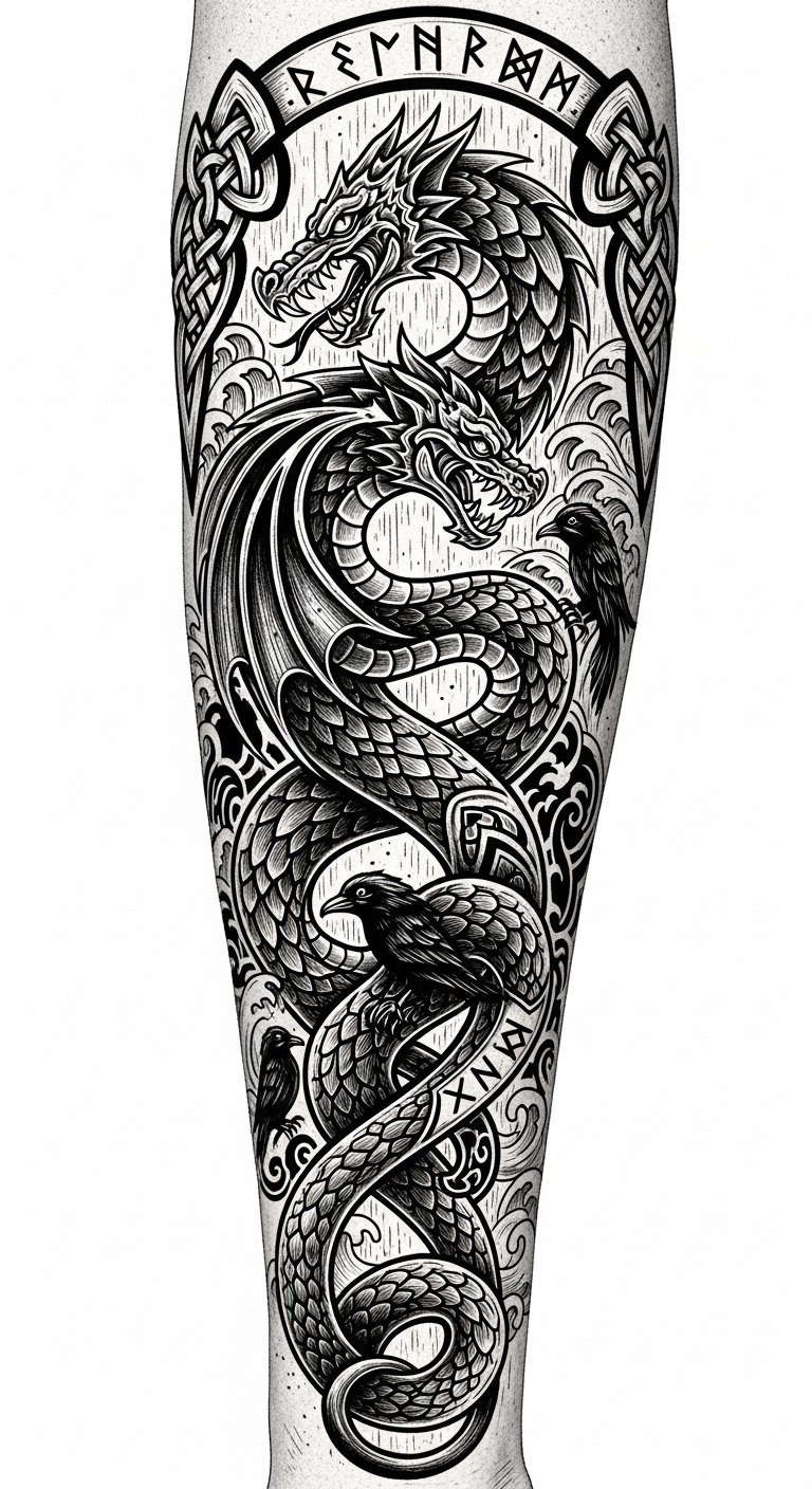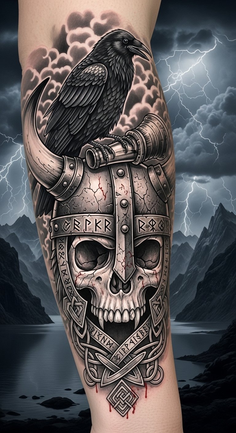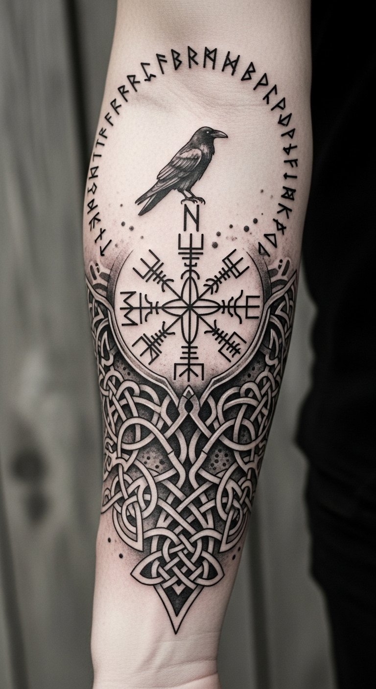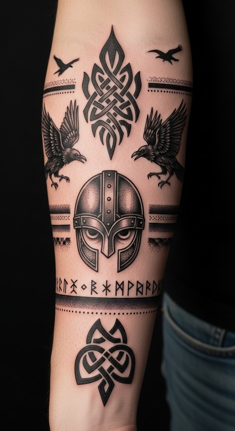 This design uses knotwork to symbolize interconnected fate, the helm for protection and leadership, ravens for wisdom and guidance, and runic bands as personal statements; emotionally it evokes resilience and ancestral pride, best placed as a wrap around the forearm or calf where movement animates the ravens and knots.
