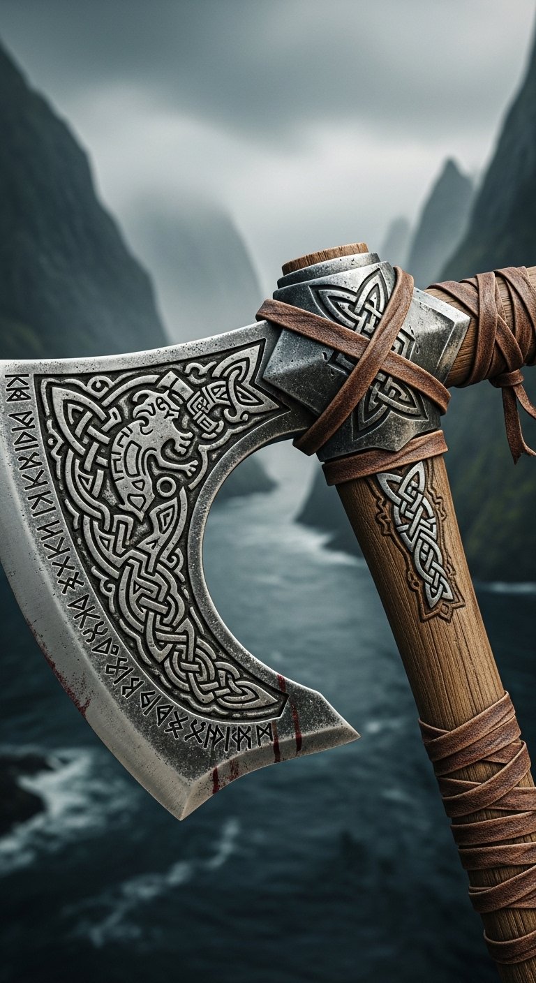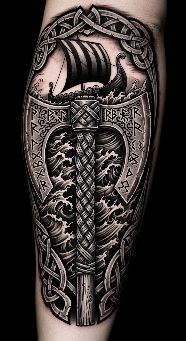 The design uses the braided axe as a personal talisman of strength, runes as coded affirmations of identity, and the longboat to signify life’s voyages; rendered in high-contrast tones to convey stoic intensity and selective blue accents to evoke sea and myth.