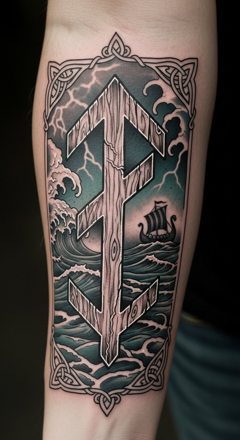 The placement on the forearm allows the Algiz to read outward as a personal talisman and public statement; the storm and longship elements evoke motion and trial, while the knotwork ties the piece to heritage.