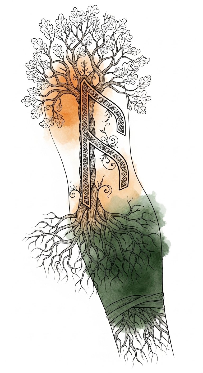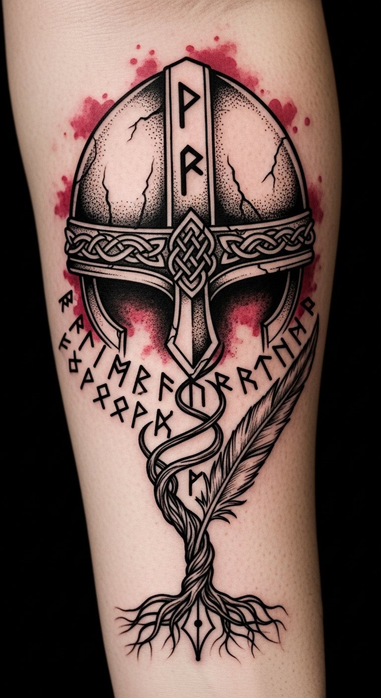 This design blends the Viking helm and runic elements to symbolize ancestral strength and inner voice, the tree-quill roots representing lived experience shaping expression, and the flowing script as your personal story; emotionally it balances defiance and reverence, suited for the forearm where visibility supports empowerment and interplay with muscle movement enhances the dynamic knotwork.