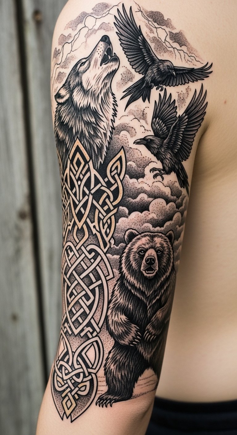A composition that balances all three animals into a cohesive sleeve or back piece: the wolf in profile howling toward the sky at the top, the bear grounded and protective in the center, and ravens circling to bridge sky and earth, all bound by Norse knotwork framing and subtle runic accents. Symbolically it channels fierce devotion (wolf), steadfast courage (bear), and wise guidance (ravens), creating an emotional arc from grounded resilience to spiritual insight. Ideal placement is mid-forearm for personal display or upper back for a larger, communal statement; shading and line weight emphasize texture and movement while keeping the piece wearable and timeless.