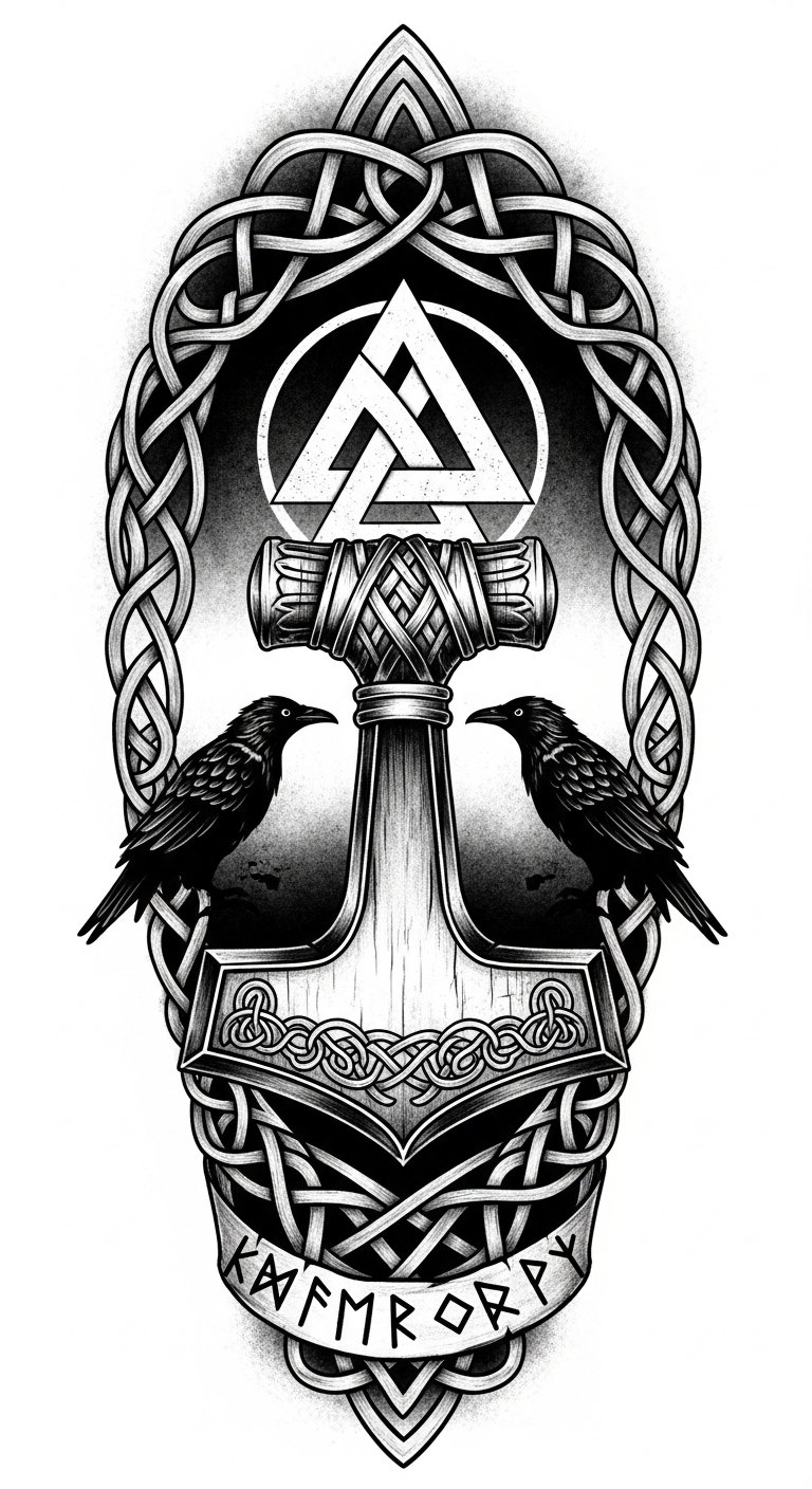 This design blends symbols of protection (Mjolnir) and fate (Valknut) with ravens that evoke Odin’s wisdom, creating an emotional balance of strength and introspection.
