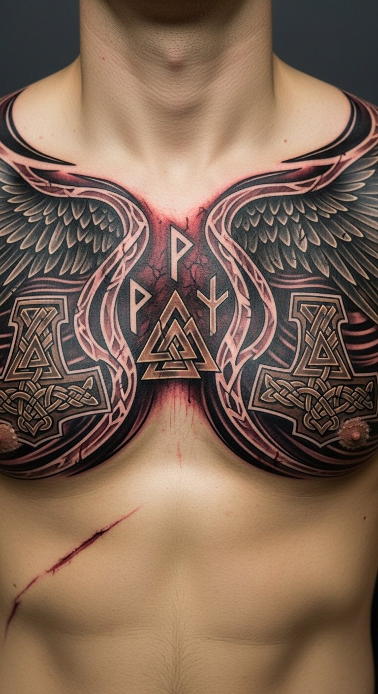 The design evokes solemn reverence and quiet strength—its weathered knotwork and raven motifs suggest guidance, transition, and the watchful presence of the divine; place it on the upper chest or shoulder to allow the triangles to sit near the heart, lending intimacy and visibility while following muscle contours for a living, dynamic effect.