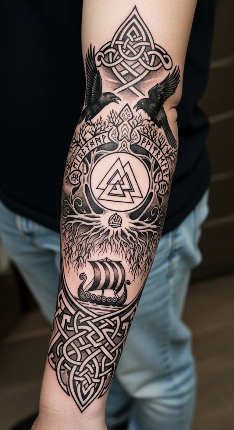 The design evokes resilience and ancestral connection—ravens for guidance, the Valknut and Yggdrasil for fate and life’s roots—best placed on the forearm or upper arm to allow the wrap-around knotwork to flow with muscle movement, conveying motion and personal narrative.