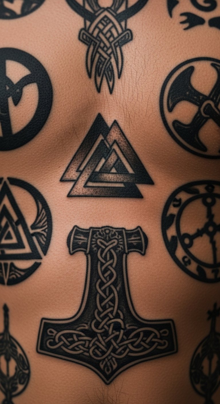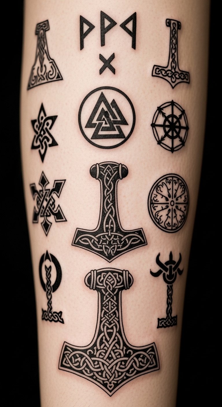 When you think of Viking tattoos, powerful symbols come to mind—each one steeped in history and meaning. Imagine wearing a Valknut, a mark of courage, or Mjolnir, Thor’s mighty hammer, etched onto your skin. These designs not only celebrate a rich heritage but also connect to your personal journey. So, what if you could find the perfect ink that resonates with your spirit? Let’s explore these fierce tattoo designs and uncover their significance together. This design combines the interlocking Valknut and Mjolnir to symbolize bravery and protection, with knotwork and runes adding continuity and personal intent; the ravens evoke wisdom and guidance, creating an emotional mix of strength and ancestral connection—ideal for inner forearm placement where visibility supports personal reminder yet can be covered when needed.
