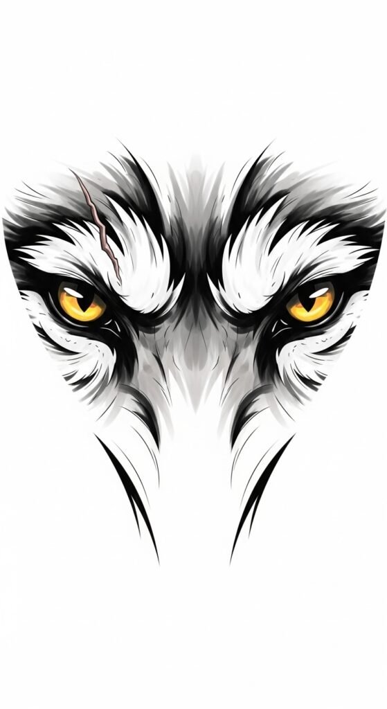 Each wolf eye color holds unique meanings, while the enthralling wolf stare serves as fierce gaze inspiration, urging you to embrace your wild spirit. This design emphasizes duality and inner strength—the contrasting amber and blue eyes symbolize passion and calm determination.