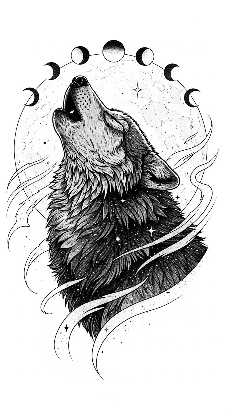 Emotionally it evokes solitude, longing, and a quiet, expansive hope; it’s ideal for upper back, shoulder blade, or forearm placement where the howling profile can face outward toward the wearer’s intended path, and where the stars can flow across contours for a sense of motion and alignment.