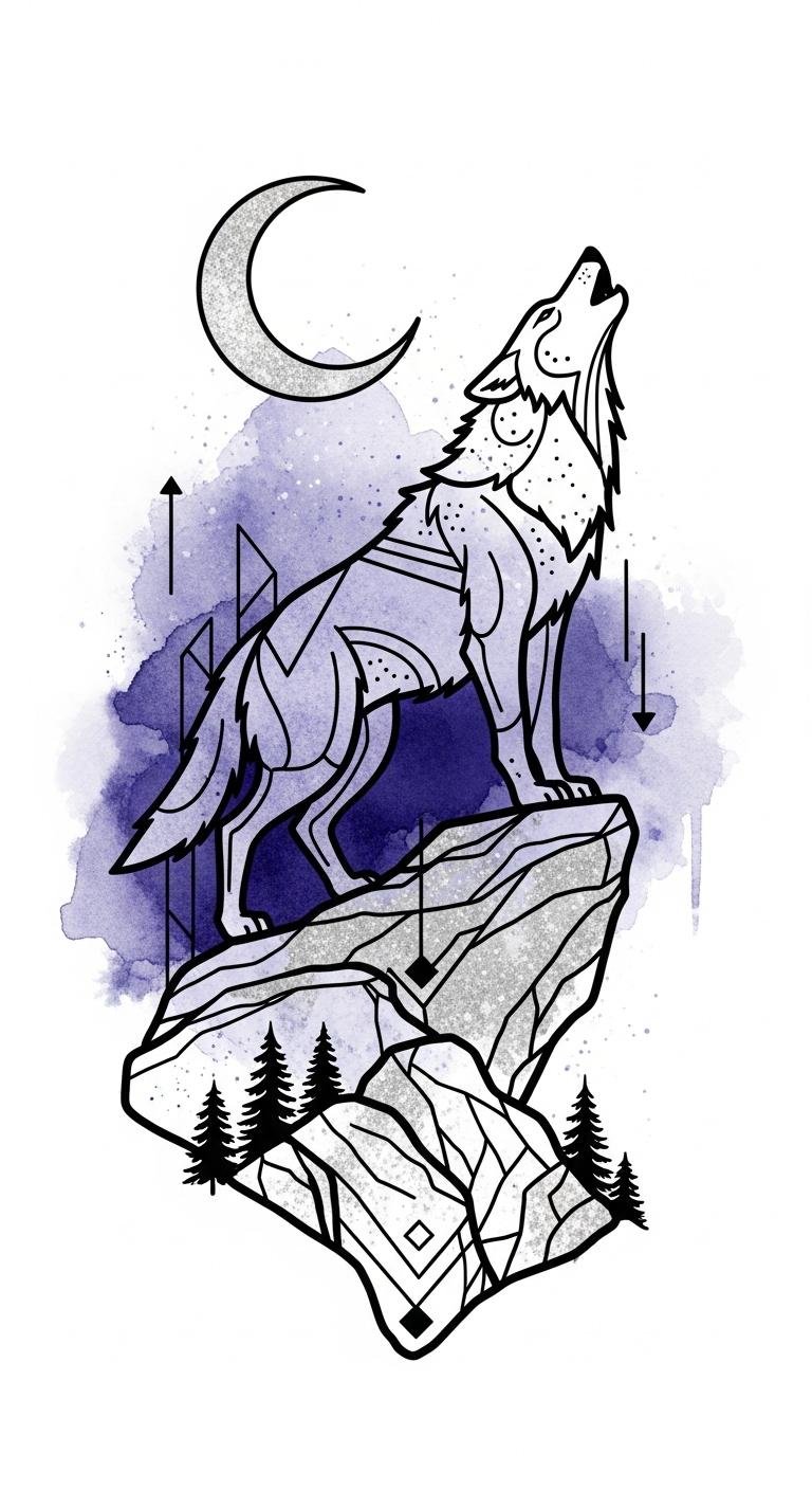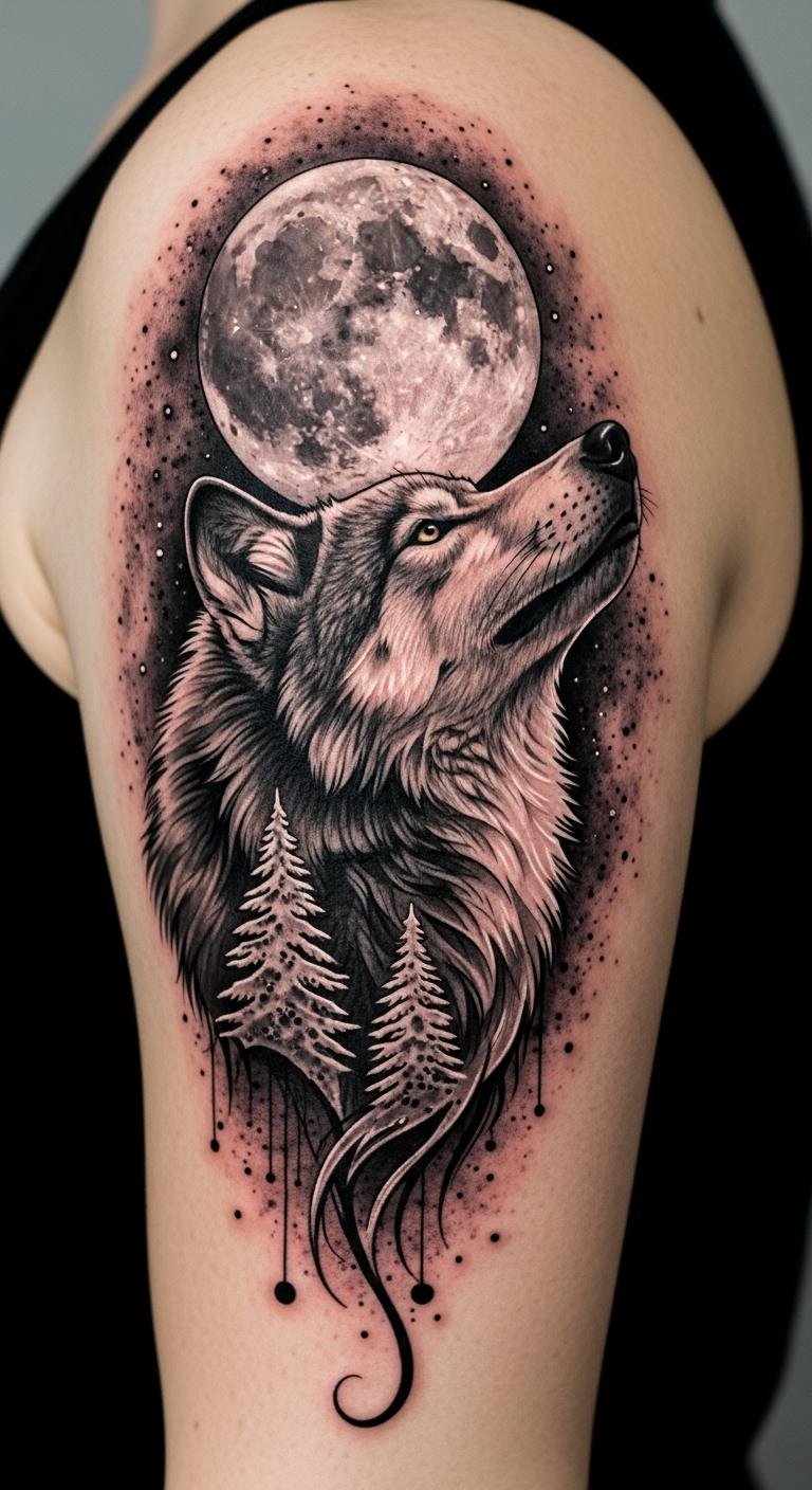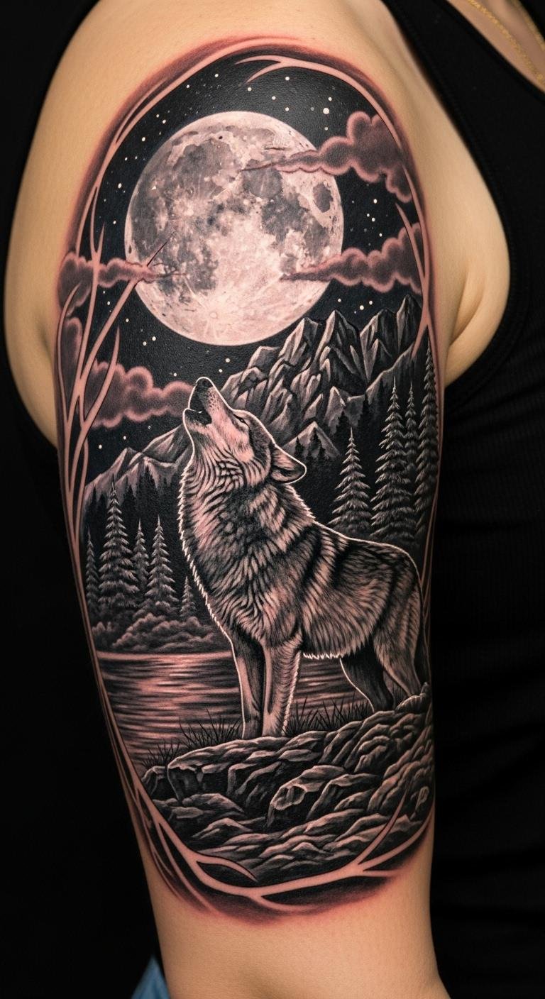 A sleeve or shoulder placement allows the wolf’s silhouette and moonlit landscape to flow with the body’s contours, using negative space for moonlight and fine linework for fur and distant trees; the design symbolizes independence, intuition, and the pull of the unknown, intended to evoke awe and inner courage whenever viewed or felt.