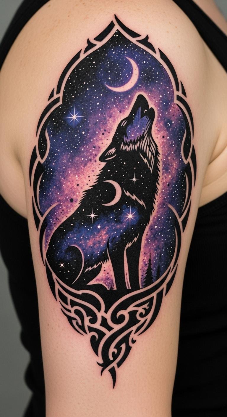 This design blends tribal linework with a celestial motif: the bold, interlocking curves of the wolf’s form transition into a scatter of stars and subtle crescent shapes that ripple outward.
