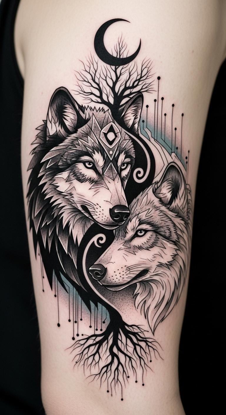 Each wolf represents a unique facet of your spirit, inviting freedom to explore and embrace the complexity within you. The design evokes tension and harmony simultaneously—dark, angular forms convey raw emotion and impulse while the lighter, flowing side suggests calm thought and empathy; place it on the forearm for visibility and personal reminder, or across the chest to center the duality over the heart.