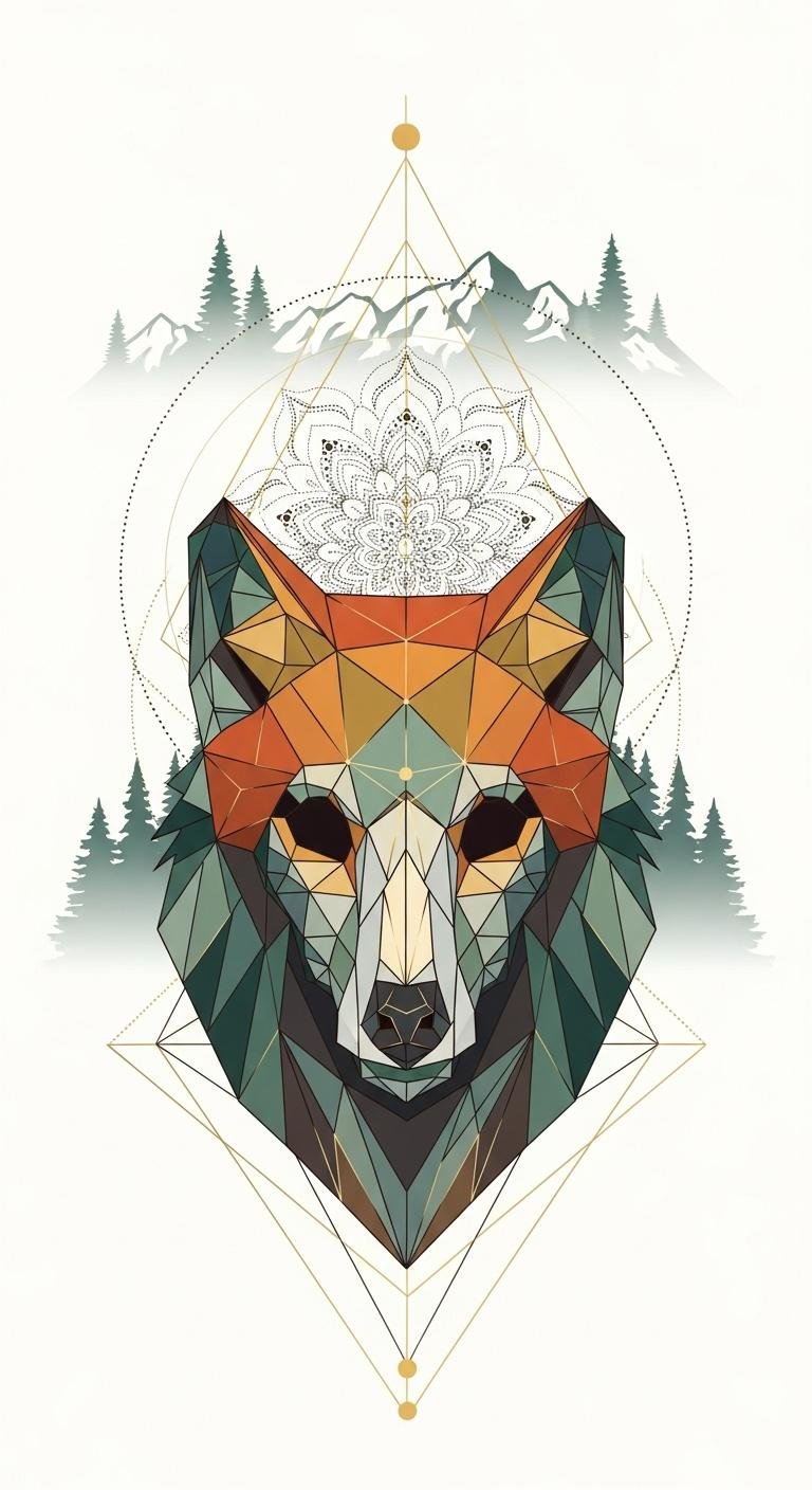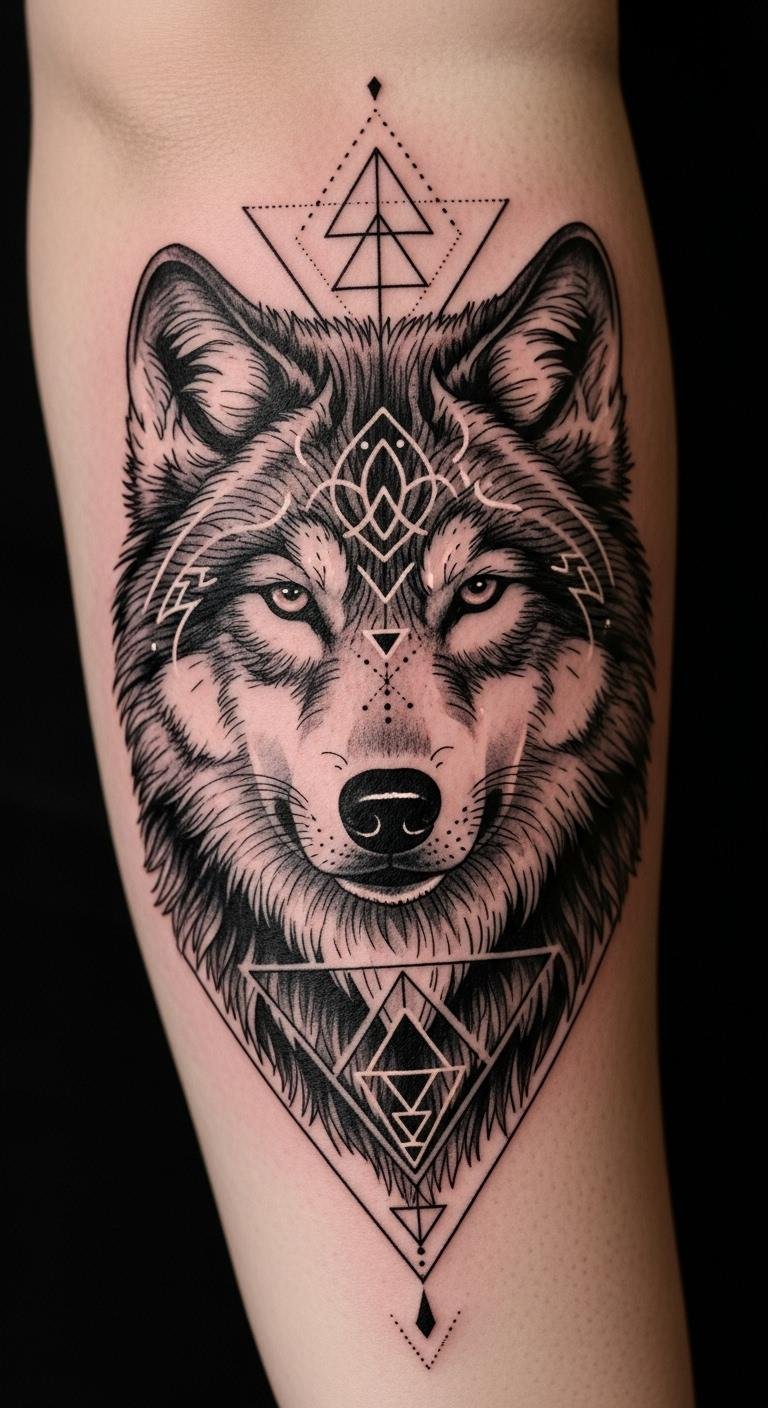 In this design, angular geometry frames a realistically inked wolf head—triangles, hexagons, and intersecting lines create a cosmic lattice around the wolf’s visage, suggesting balance between instinct and order.
