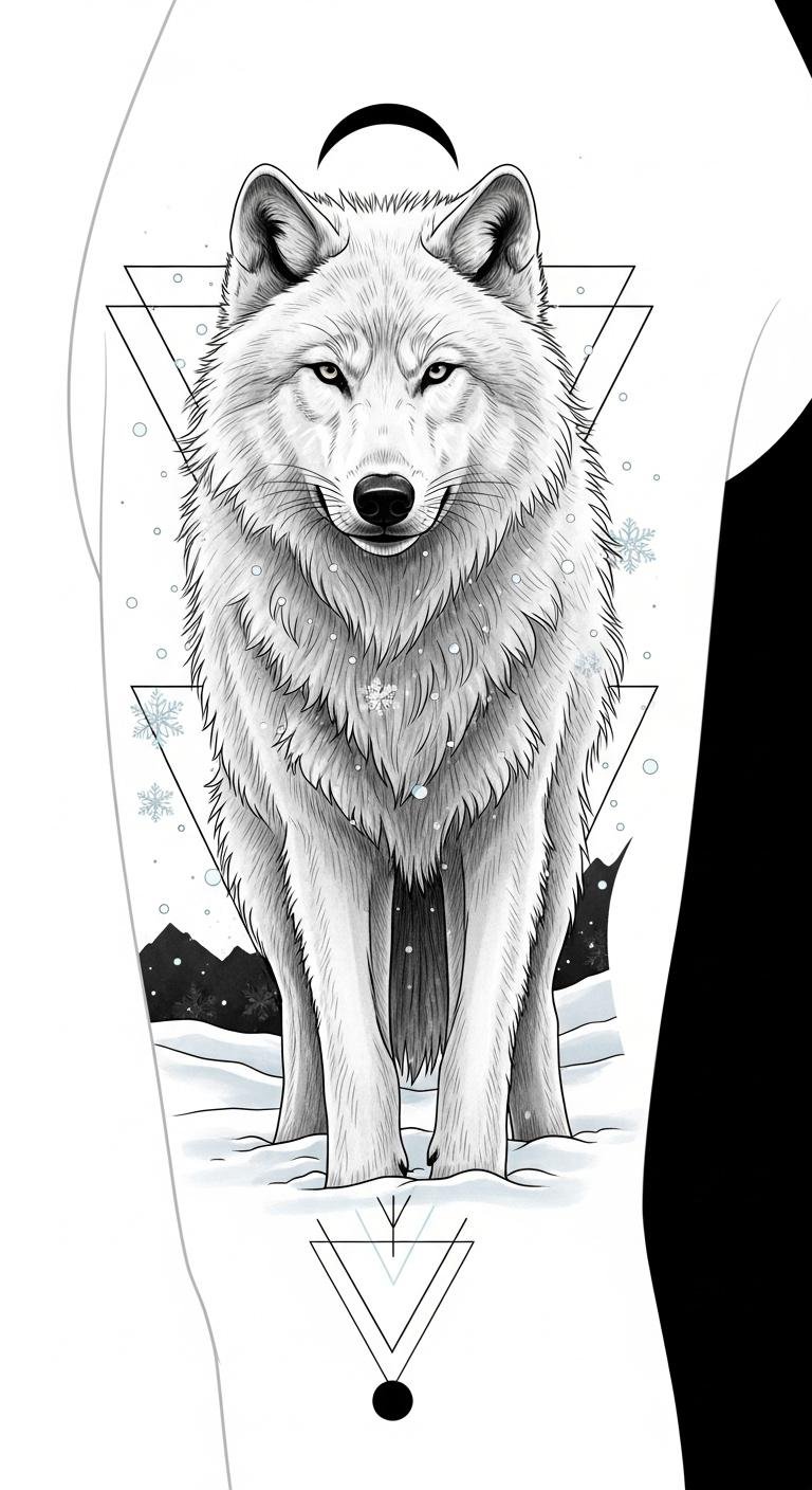 The design pairs stoic strength with serene isolation—the wolf’s steady gaze conveys endurance while falling snow softens the composition, making it emotionally evocative; ideal placement is the upper arm or shoulder for a bold statement, the forearm for visibility, or the upper back for larger, more detailed work.