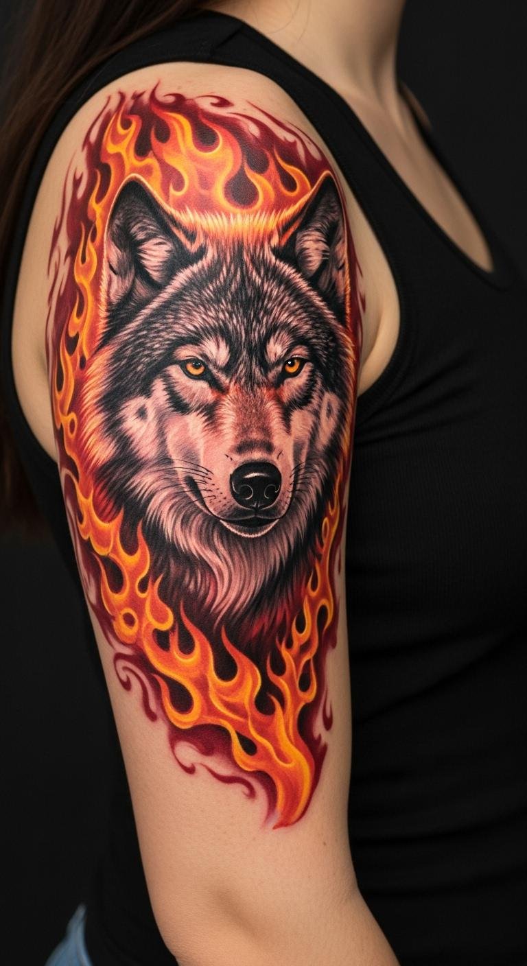 This design channels the wolf as a guardian of inner power: the snarling, forward-facing head and flowing mane suggest vigilance and courage, while stylized, curling flames wrap the form to represent transformative passion and relentless drive.