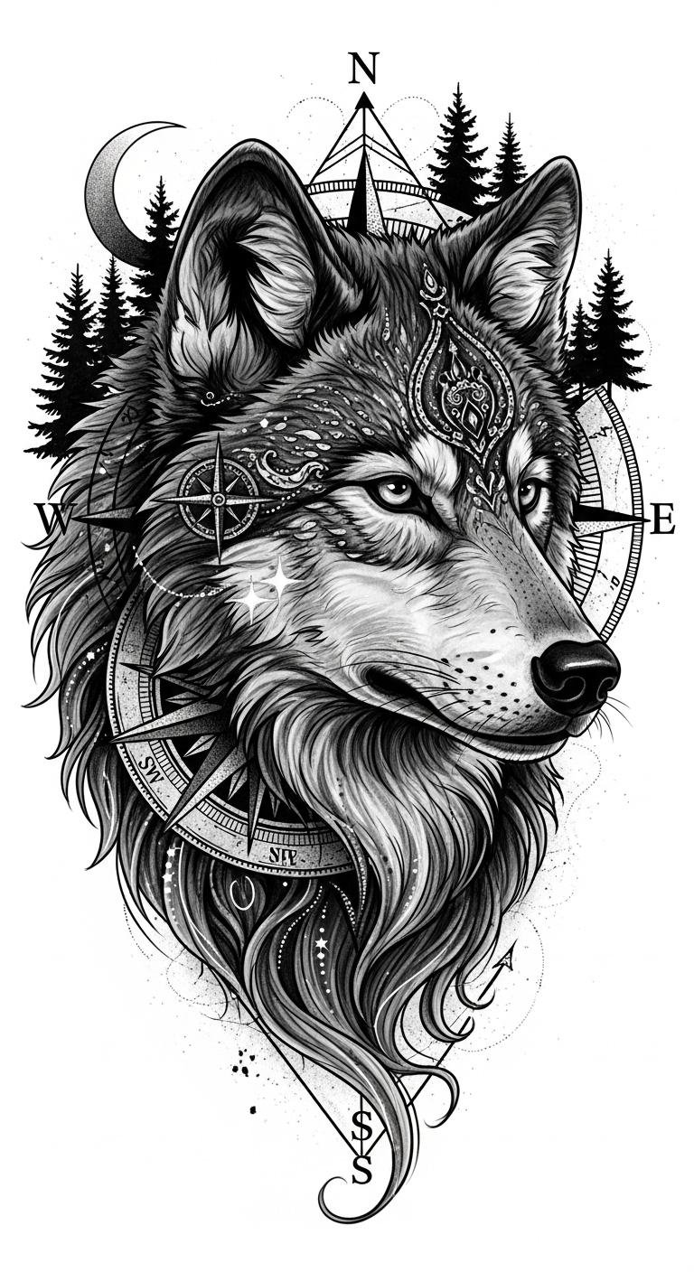 With every glance, it reminds you that true directional guidance comes from within, urging you to roam freely and chart your own path through life’s wild terrain. This design channels resilience and inner guidance—the wolf as instinct and courage, the compass as clarity and choice—evoking determination and calm confidence; ideal on the upper arm or shoulder blade where curves accentuate the flowing fur-to-compass transition and allow visibility or concealment as desired.