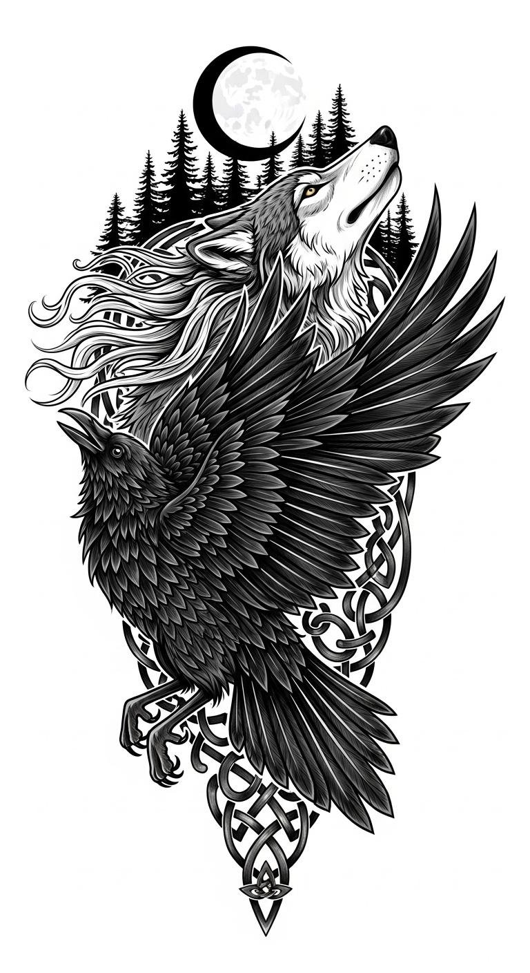 The design evokes resilience and guidance—place it on the upper arm for a visible personal talisman, the shoulder blade for a private emblem, or the back for a larger, epic composition; the interplay of texture and contrast creates movement and emotional depth, suggesting protection, transformation, and an enduring bond between intuition (raven) and instinct (wolf).