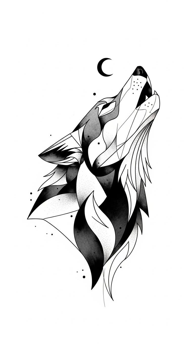 This design uses interlocking geometric lines to evoke shared language and coordinated movement, the howling head and crescent moon signaling call-and-response within the pack; it conveys solidarity, protection, and an untamed emotional current.