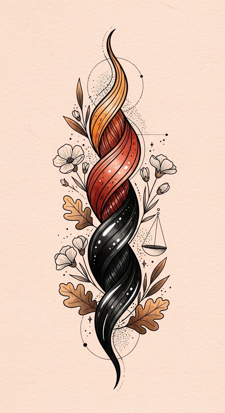 Understanding this balance can empower you to enhance and maintain the health of your hair strands effectively. This design symbolizes the duality and harmony of one’s natural coloration—the intertwining strands speak to genetic heritage and personal identity, the botanical accents evoke growth and care, and the muted watercolor tones convey warmth and introspection;