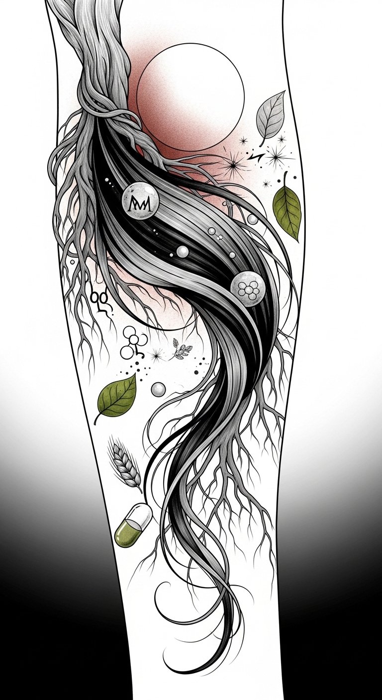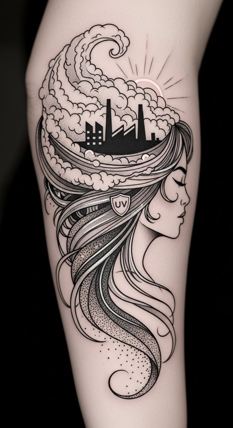 The gradient hair coloration visualizes pigmentation change and resilience. Ideal placement is the forearm or shoulder where the flowing design can wrap naturally, allowing visibility for personal reflection or concealment as desired.