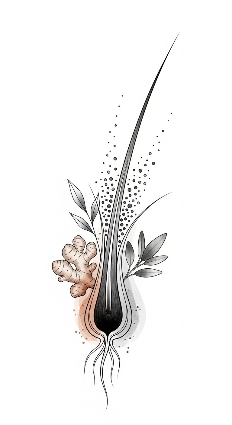 The nutrient icons and gentle scalp texture reference “nurturing your scalp and providing essential nutrients” while the continuous loop and glowing anagen root symbolize “enhance hair growth” and “promote vibrant, healthy strands that reflect your individuality.”