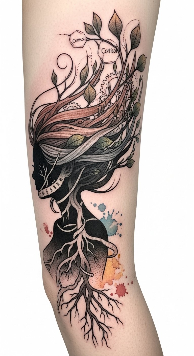 This tattoo blends organic growth and mechanistic elements to symbolize how internal stress alters outward appearance: the hair-root-branch metamorphosis represents life’s continuity and vulnerability, the cortisol motifs and gears hint at biochemical and temporal forces, and the frayed threads convey emotional strain.