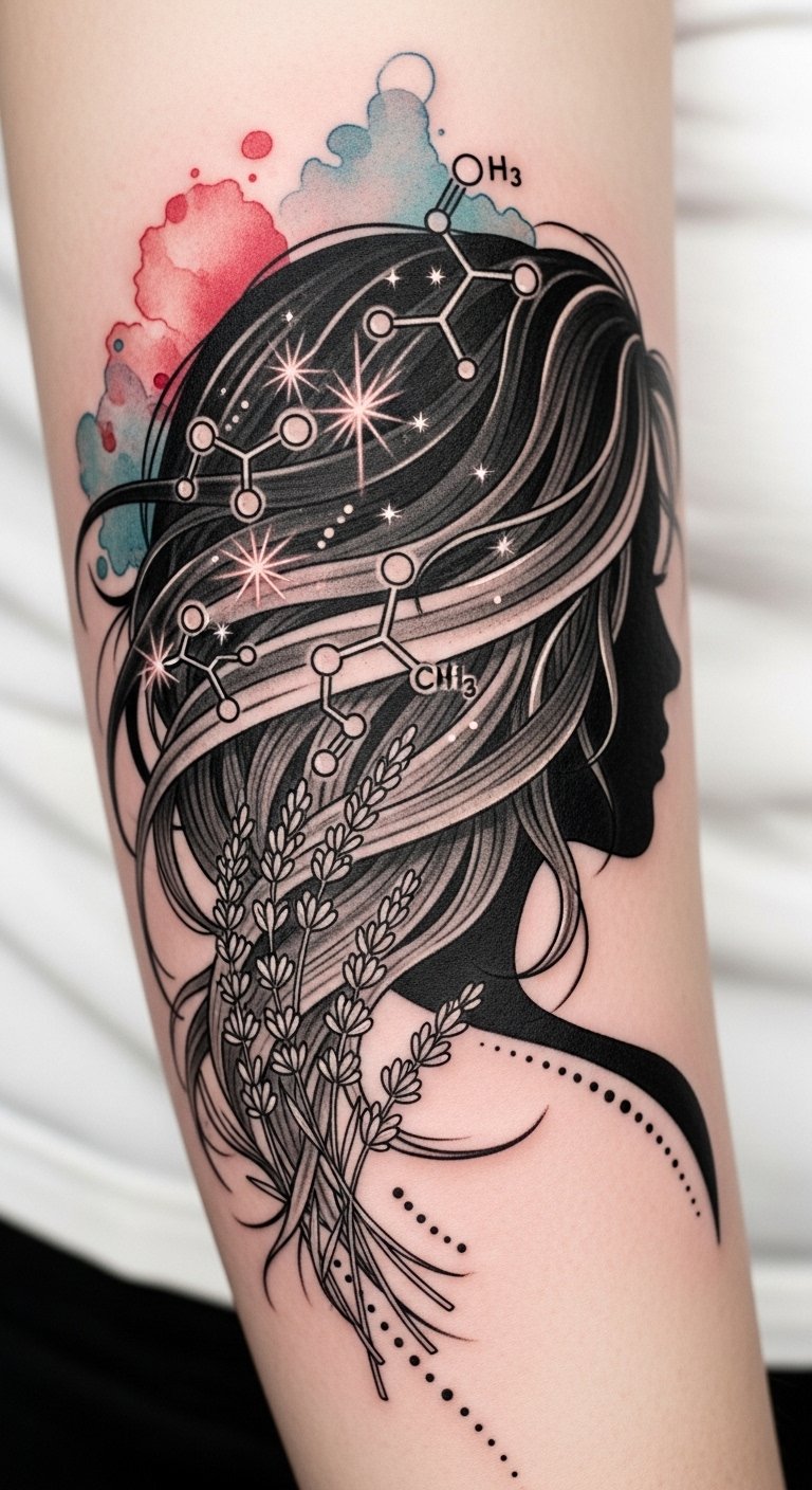 This tattoo concept symbolizes bodily change and self-awareness—the transitioning hair colors and molecule motifs capture the science and poetry of hormonal influence, while watercolor tones evoke emotional warmth and calm; ideal placement is the inner forearm or along the ribcage for a personal, intimate reminder of resilience and transformation.