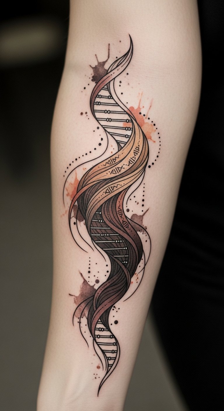 The design symbolizes unity in variety, evoking both scientific precision and organic beauty; it aims to feel intimate and proud, appropriate for visible but personal areas like the forearm, wrist, or nape where it can be both a conversational emblem and a private reminder of identity and heritage.