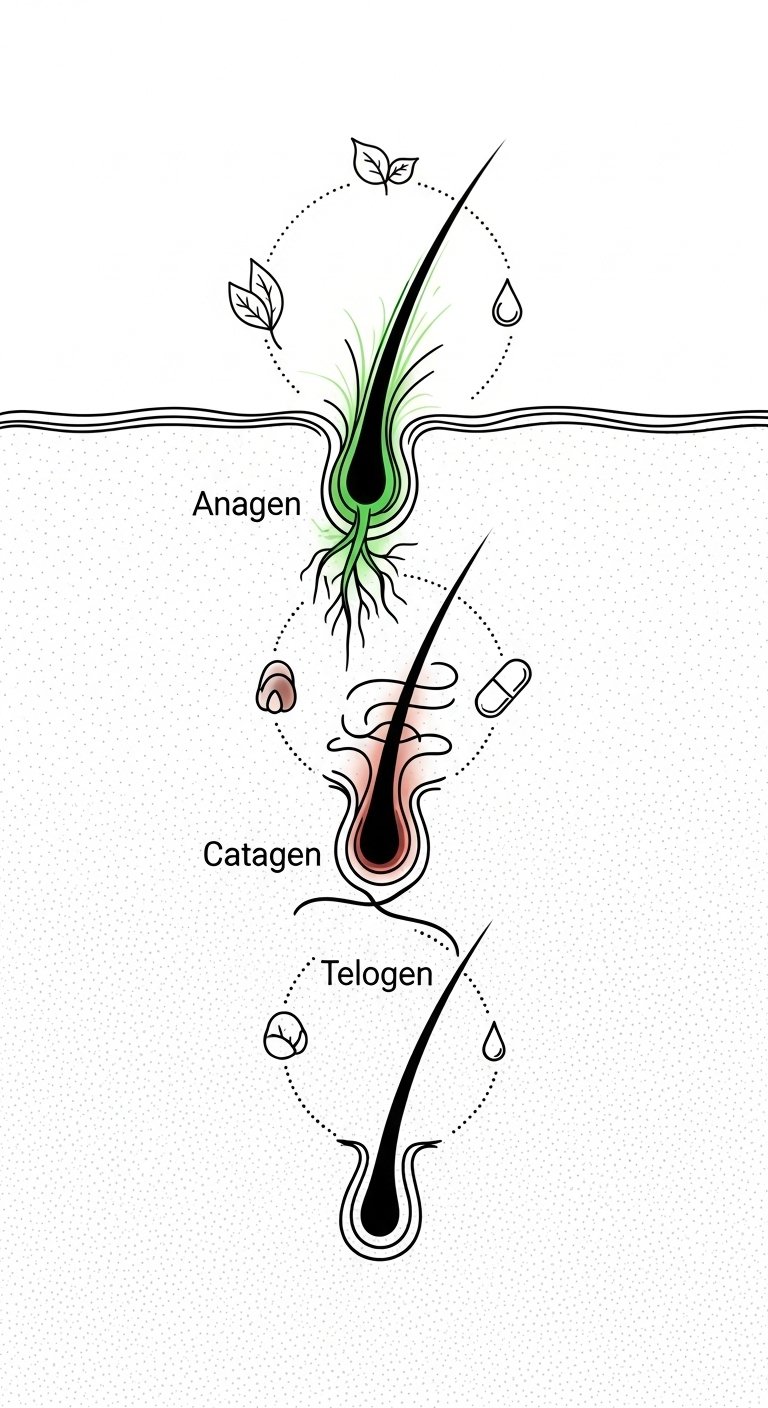The design mirrors the original passage’s exact wording by visually tracing the “complex cycle of activity” through three distinct follicle states—anagen, catagen, telogen—arranged to emphasize growth, rest, and shedding.