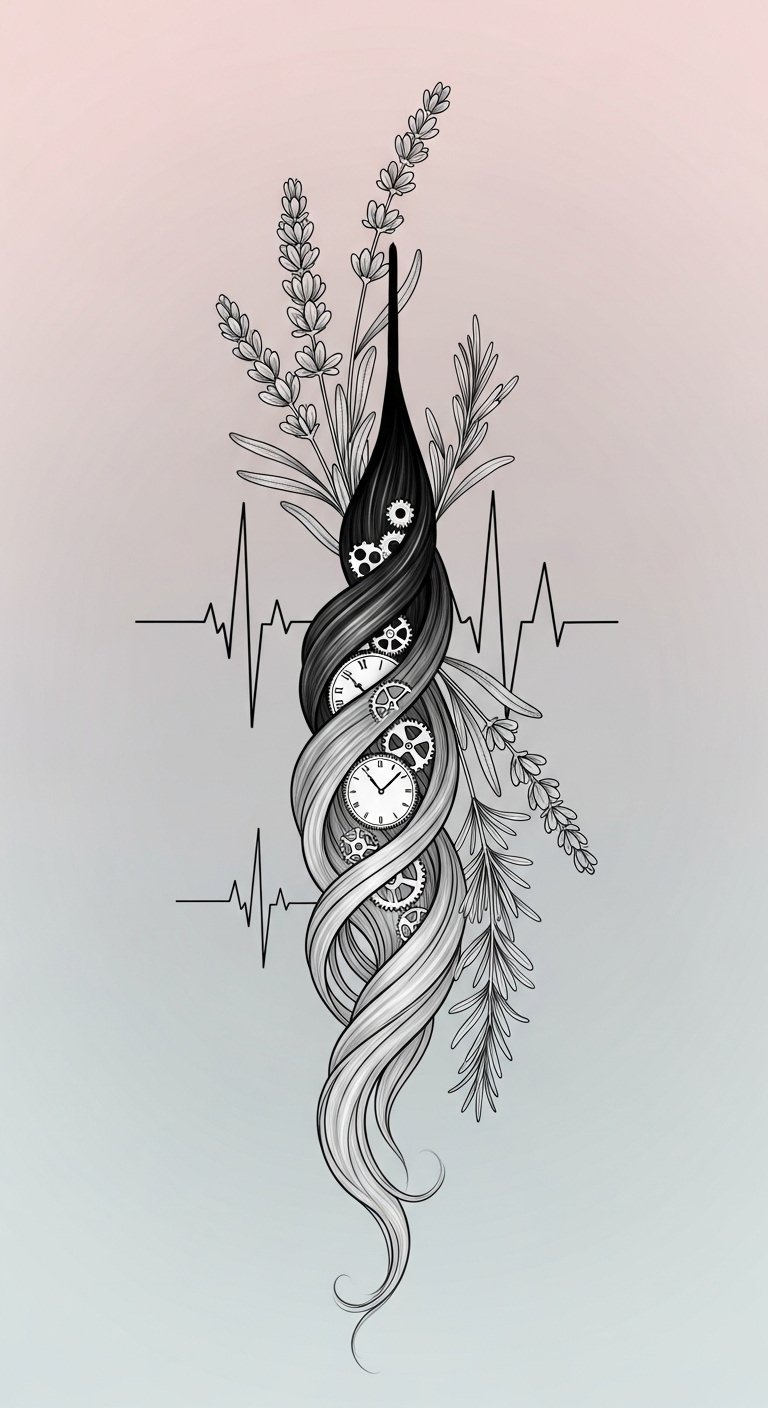 The design symbolizes the interplay between time, health, and inner life—the hair’s color shift shows the personal journey through stress, the clock gears denote time and aging, heartbeat lines capture emotional turbulence, and botanical elements suggest healing and resilience; place on the forearm for visible reminder or on the nape for a private talisman.