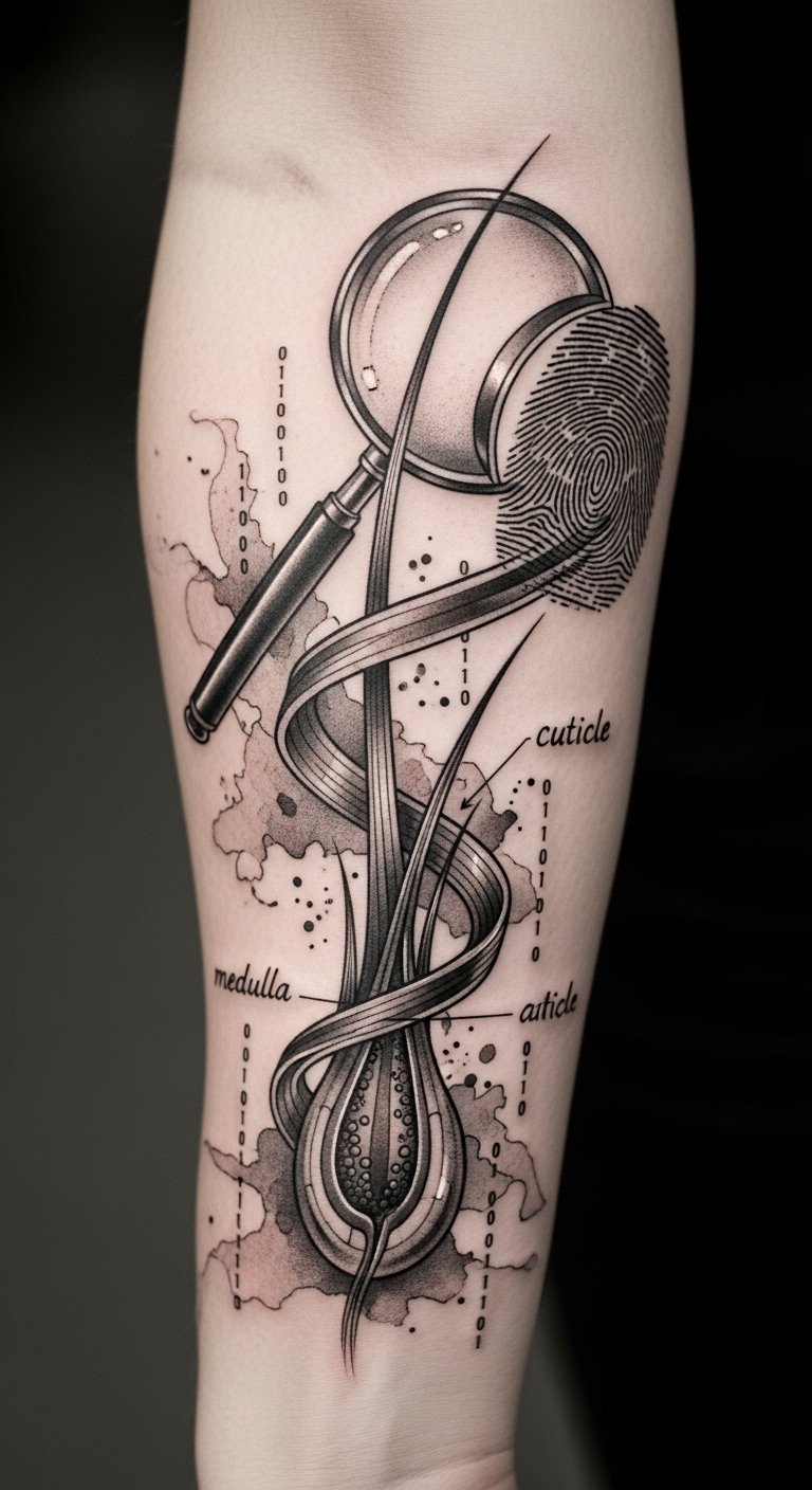 The color stability of hair can aid in establishing timelines, making this knowledge essential for effective investigations and achieving justice. This design symbolizes the intersection of science and truth—hair becoming tools of inquiry—while the magnifying glass and fingerprint evoke investigation and identity.