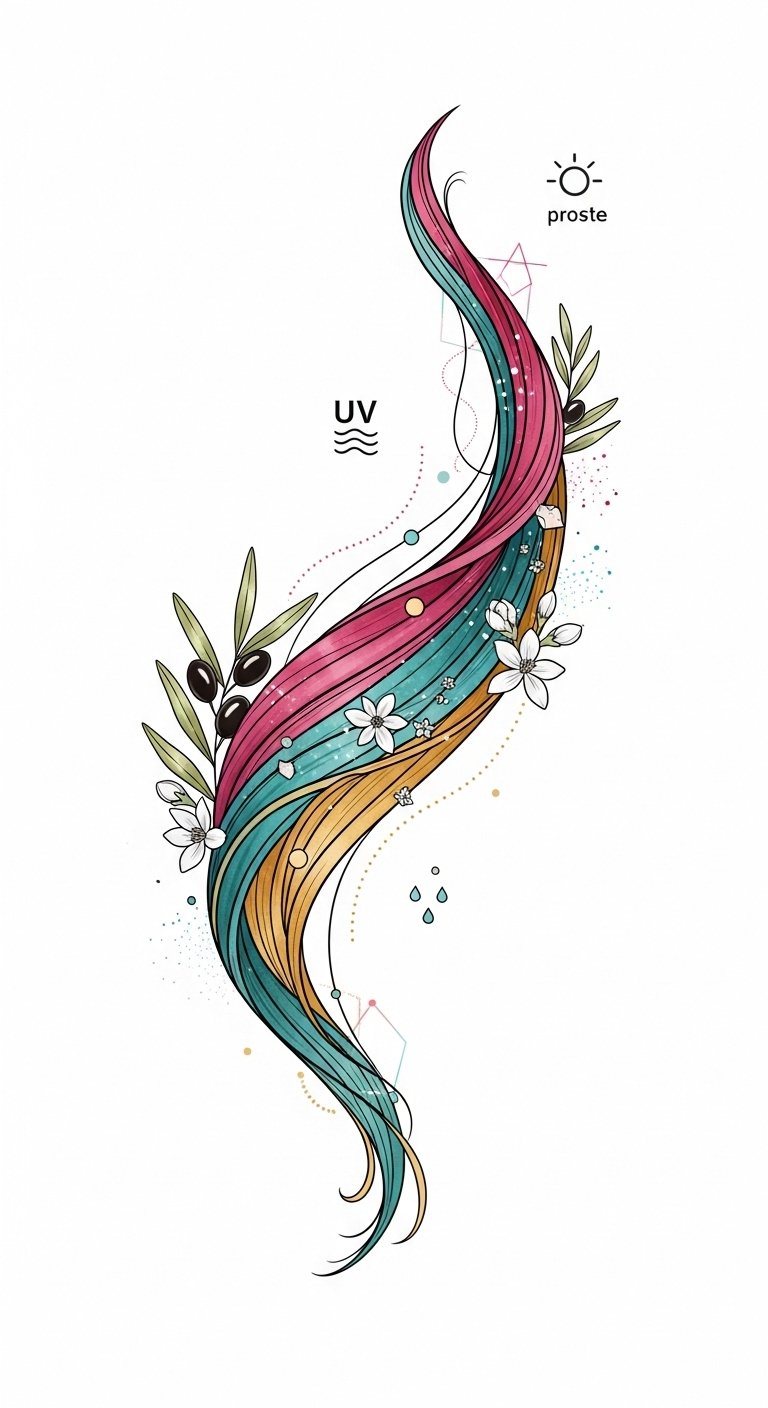 To symbolize maintenance and care, the flowing lock represents continuity and routine while the vibrant ribbon colors evoke vitality and preserved color; botanical elements and blossoms suggest natural, gentle alternatives and nourishment, and the sun and wave icons denote UV protection and hydration.