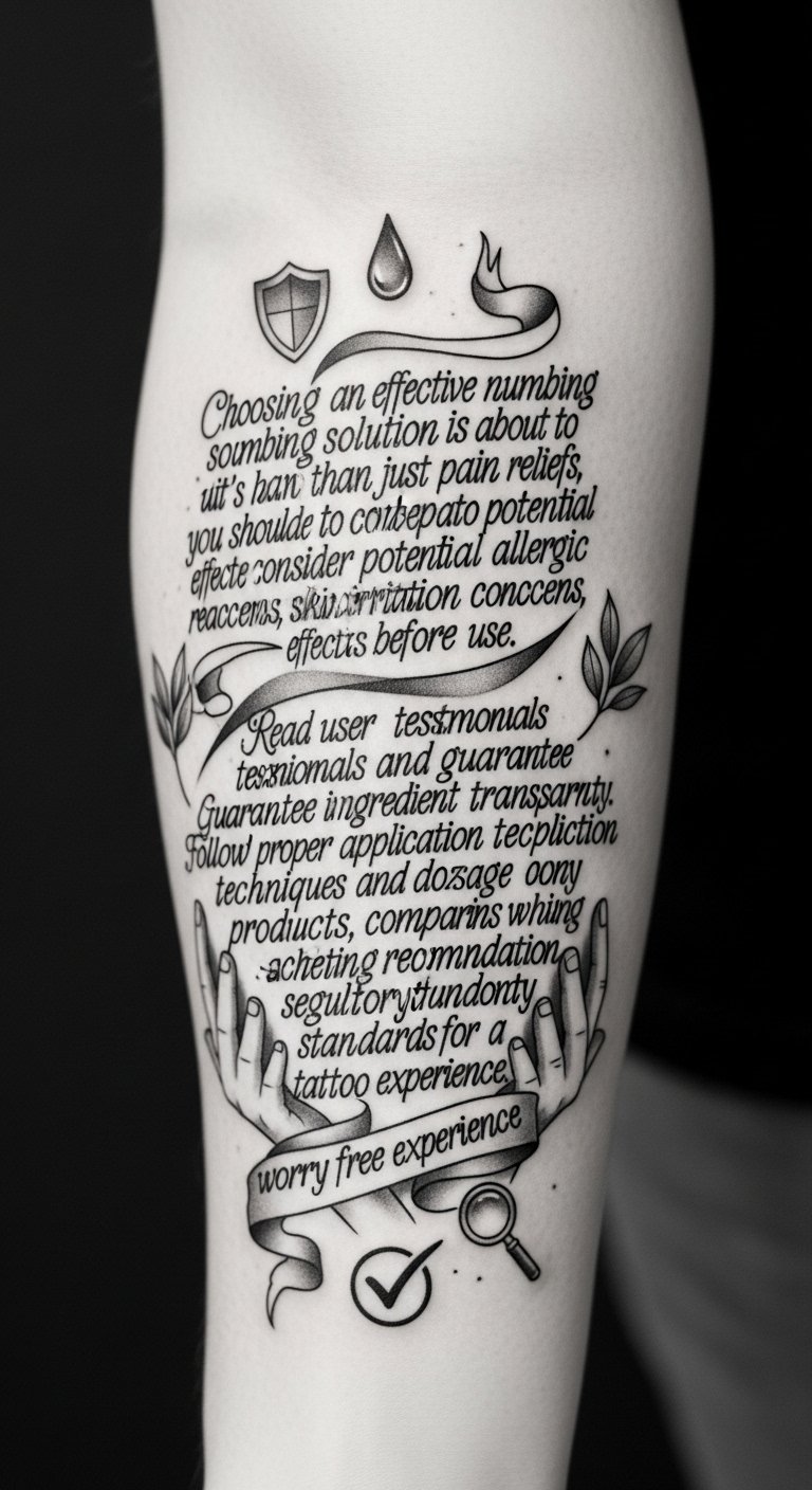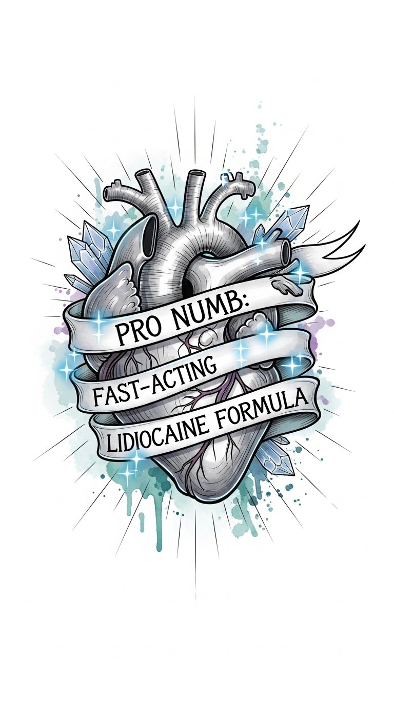 The heart symbolizes the emotional core of getting tattooed—passion and commitment—while the ribbon bearing the exact text ties the functional, practical comfort of numbing to the personal act of expression.
