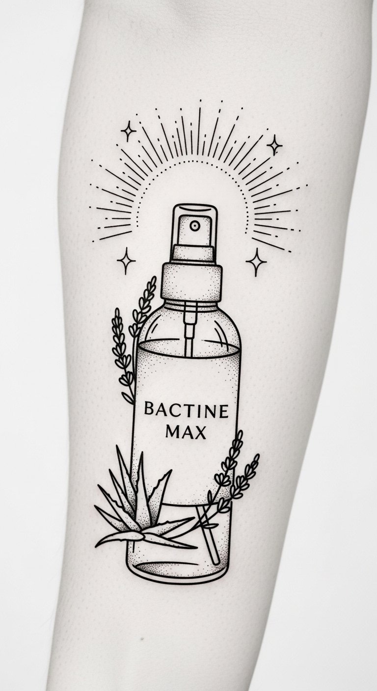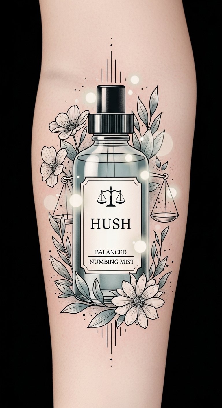 While many numbing sprays promise relief, Hush Anesthetic Spray stands out due to its expertly balanced ingredients that cater specifically to the needs of tattoo artists and clients alike. The hush benefits include a formulation that combines effective numbing agents with skin-soothing components, ensuring a comfortable experience. This balanced formulation minimizes irritation, allowing you to focus on your tattoo journey with confidence and ease. The design symbolically merges the bottle with botanical elements to represent science and nature in harmony; the numbing mist and scales evoke balance and calm, conveying trust and relief. Emotionally it reassures the wearer and client, calming pre-tattoo nerves and celebrating the collaborative process. Ideal placement is the forearm or upper arm where visibility and size let the fine-line and dotwork details read clearly and the symbolic composition wrap naturally with the musculature.