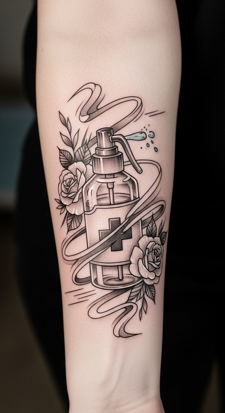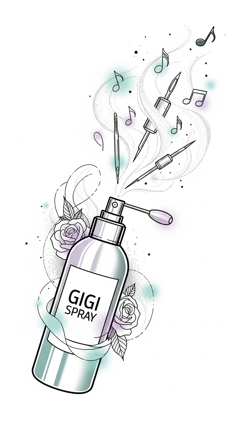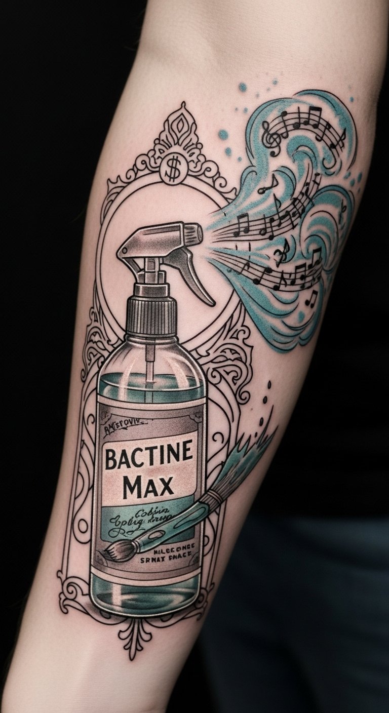 This design symbolizes the transition from preparation to creation—the bottle and mist represent care and comfort, the transforming mist into needles and roses ties the tool to the art it protects, and musical notes suggest rhythm and flow of the tattoo process; emotionally it balances calm reassurance with creative energy.