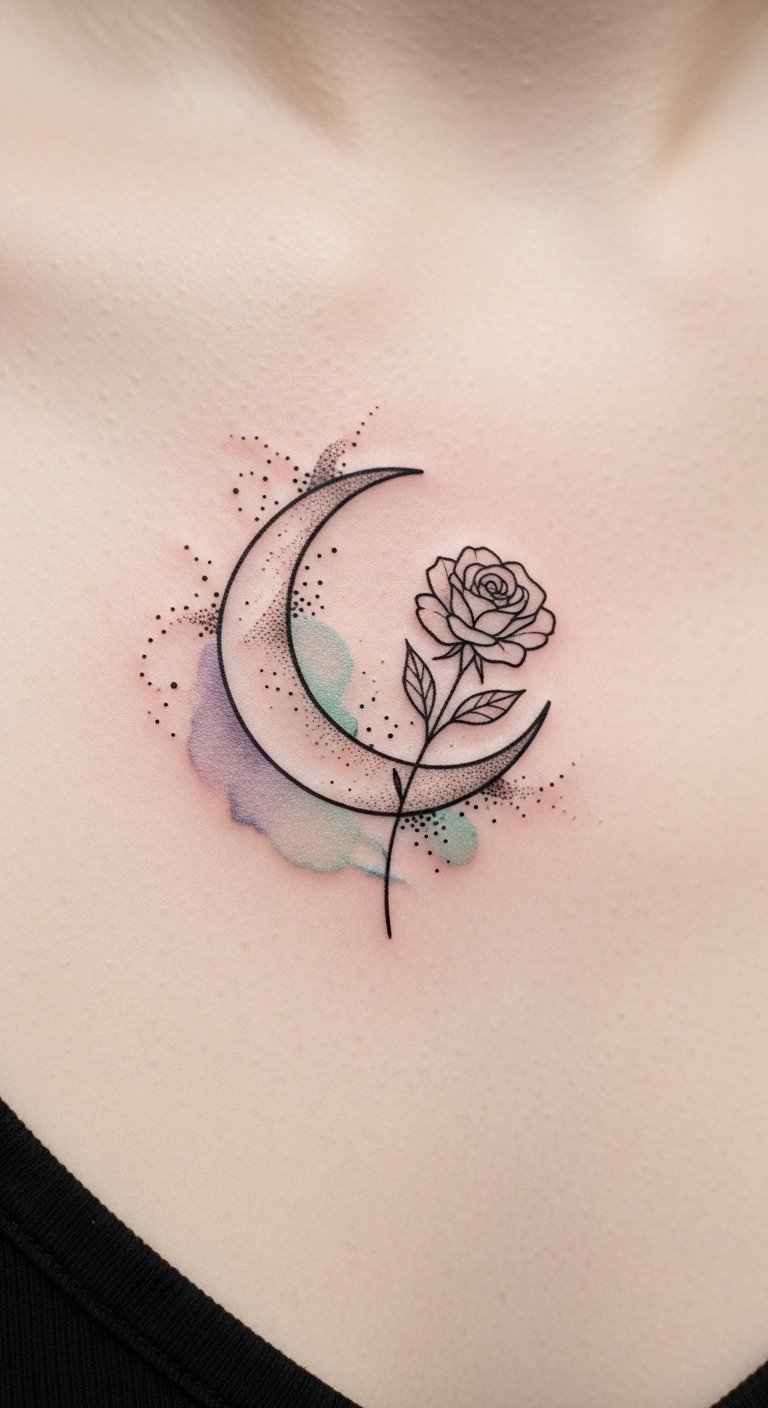 The crescent moon cradling the rose symbolizes protection and renewal, offering a calming presence in an intimate spot; the fine linework and dotwork create a soothing visual rhythm that mirrors the aim of reducing discomfort and fostering resilience, while the muted watercolor wash adds quiet emotion and softness.