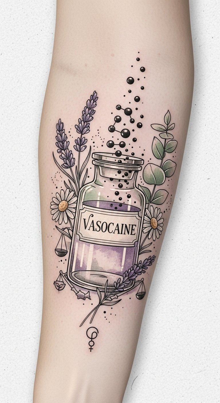 This design symbolizes the balance between comfort and craft: the tattoo machine represents the art and intensity of inking, while the lavender and aloe signify soothing relief and healing. The steam-like molecular wisps hint at formulations and science, and the subtle product names personalize the concept without commercial dominance. Emotionally it reassures—transforming anxiety about pain into a calm, intentional choice. Ideal placement is the outer forearm or calf where the wrap can be seen during sessions and serves as a reminder of self-care in the process.