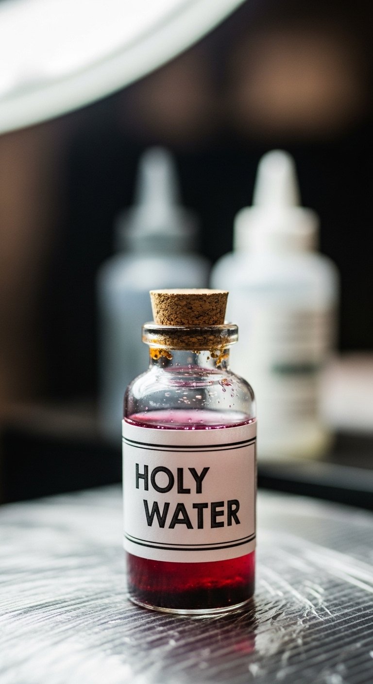 A design that juxtaposes a cracked, ornate vial labeled “Holy Water” dripping into a delicate inked rose, with jagged waveform-like bands around the bottle to represent varying potency; subtle shadowed faces in the background show shifting expressions from calm to grimace, and faint blueprint lines and measurement marks suggest evaluation and testing. The symbolism captures mistrust and hope—beauty and pain intertwined—conveying the emotional uncertainty of seeking relief that may not be consistent. Ideal placement: forearm or upper arm where the flowing drip can follow natural contours and viewers can read the vial details up close.