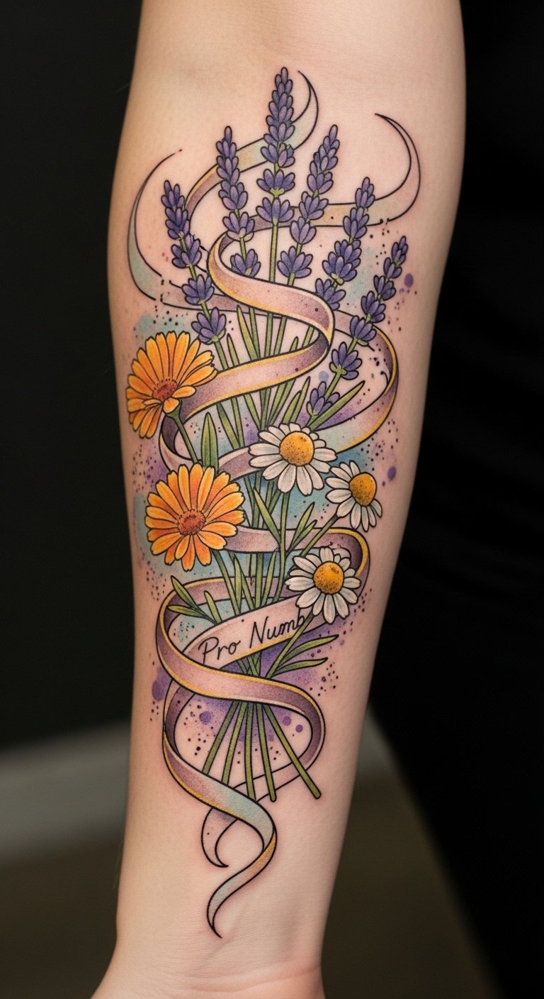 Soft watercolor tones and fine-line detail evoke tenderness and vulnerability, making the forearm an intimate yet visible placement that reads as both personal ritual and quiet celebration of empowerment through care.