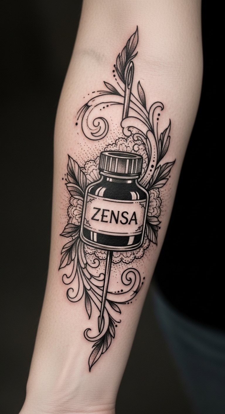 A flowing, minimalist forearm tattoo that visually interprets the original text: a gentle wave of soft blue and pale green watercolor strokes symbolizing comfort and healing, intertwined with a subtle line-art syringe morphing into a paintbrush to represent Zensa’s numbing and anti-inflammatory benefits, and delicate, fading dotted lines that suggest reduced pain pathways; place the design along the outer forearm or ribcage where the movement follows the body, evoking calm, empowerment, and the freedom to focus on artistic expression rather than sensation.