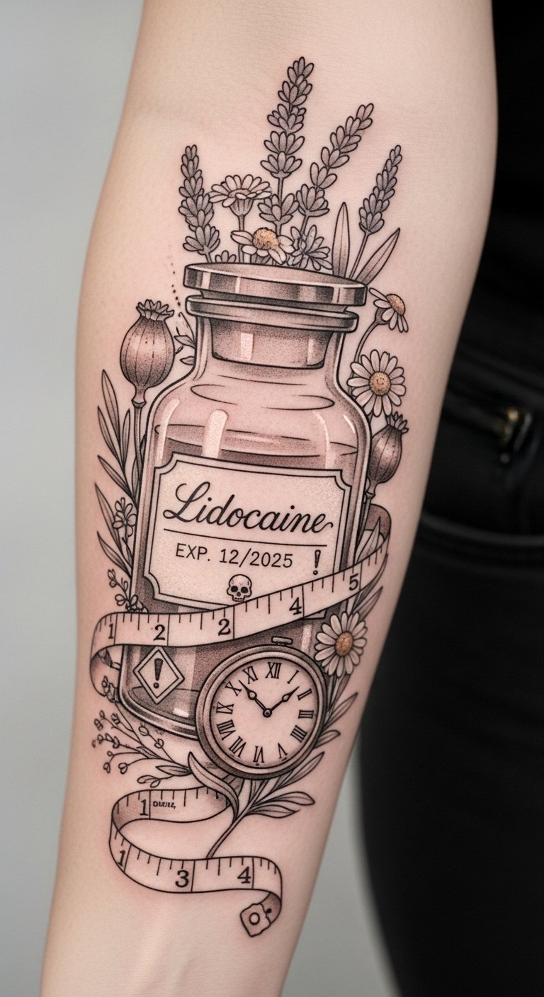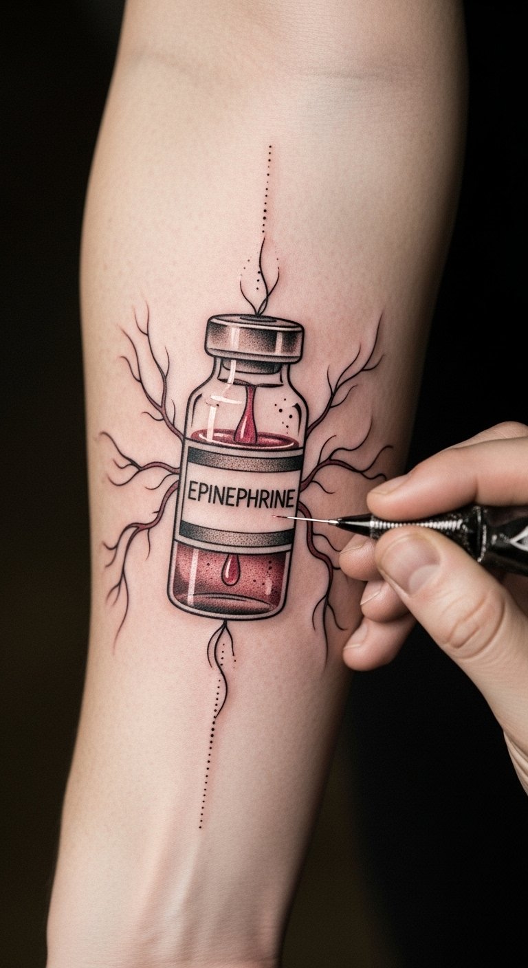 The design symbolizes control and clarity: the epinephrine vial and constricting vessel motifs represent reduction of sensitivity and swelling, while the artist’s steady hand and clean skin areas convey focus on intricate detail.