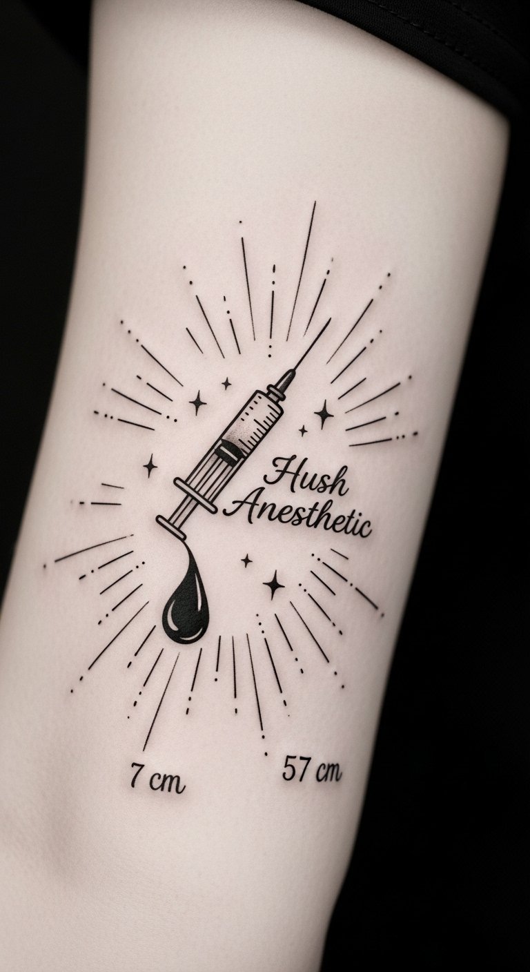 The design symbolizes trust and relief: the syringe-to-ink motif merges medical precision with artistic creation, reflecting professional artists’ endorsement and the product’s role in easing the tattoo experience.