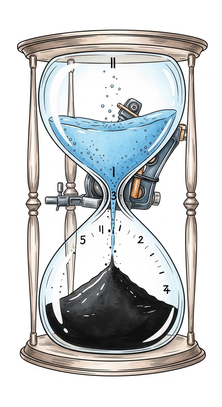 The flowing ribbons and clock motifs represent layering and timing, highlighting careful technique and control, while the meditative figure conveys emotional calm and trust in the process.